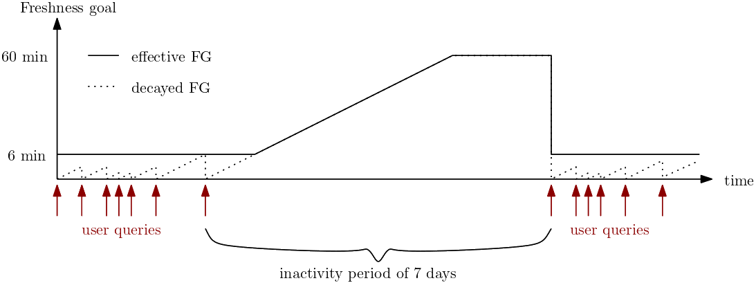 This example shows where the freshness goal (solid line) changes in response to the absence of queries by users. The freshness goal, which is configured to be 6 minutes, decays at a rate of 1 minute per hour without users accessing it. The decay process starts with a freshness goal of 0, which causes the decay effect to take longer on Datasets with looser goals. In this example, the six minute configured freshness goal is tighter than the decayed goal for 6 hours after the last user query. At the 7th hour, the effective freshness goal exceeds the original freshness goal. Once an effective freshness goal of 60 minutes is reached, the goal isn’t loosened anymore, as further cost savings are generally small at this point. As soon as the Dataset is queried again, the freshness goal is tightened back to its setting, and the decay level returns to zero.