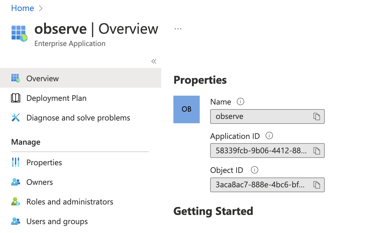 - Record the Enterprise App Object ID (3aca… in the above screenshot)