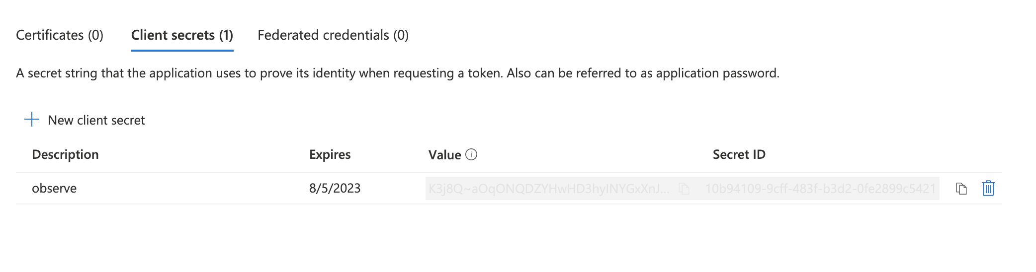 - Create a Client Secret by clicking “Add a certificate or secret”.