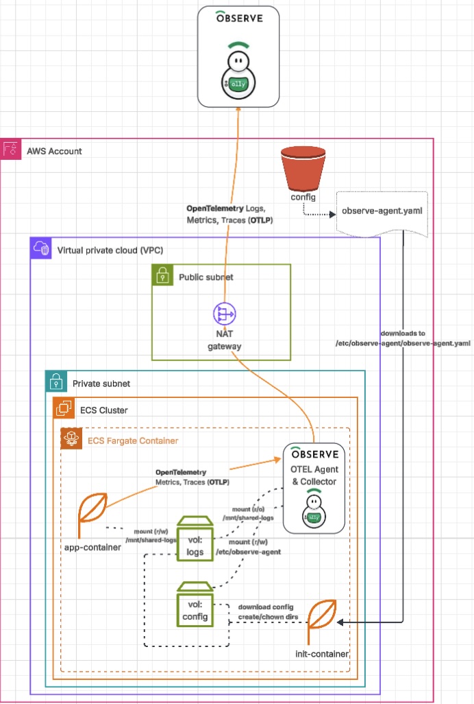 /etc/observe-agent/observe-agent.yaml. See Use Amazon EBS volumes with Amazon ECS in the Amazon documentation. - init container that renders a template from shell environment variables (populated by ECS and/or Secrets Manager)