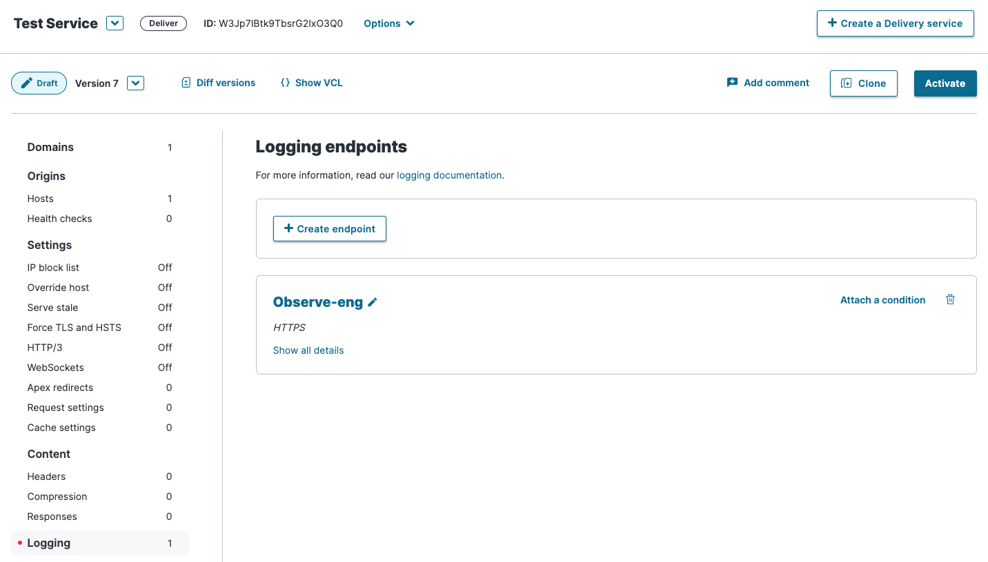 To configure a logging endpoint for your service, navigate to the configuration page for any service in Fastly.