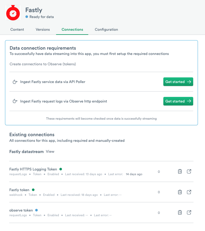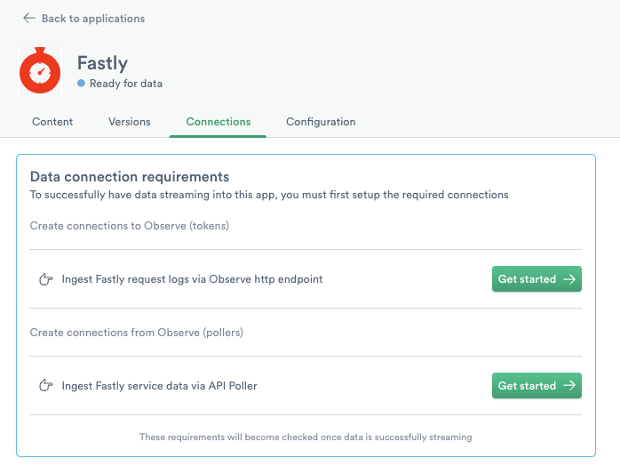 After you install the Fastly app, go to Fastly and configure the HTTP logging endpoint and Observe poller. Click Get started for each task to begin.