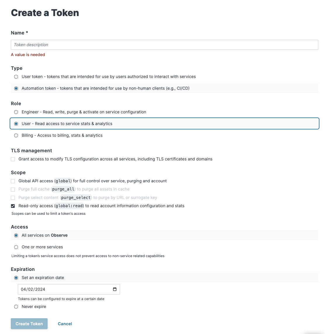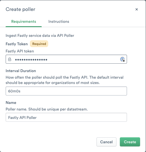 Pollers periodically request data from the Fastly API, allowing ingestion of additional Fastly service metadata. In order to set up a Poller, you'll need to first configure API credentials in Fastly.