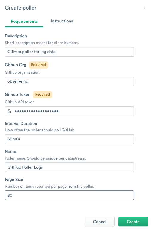 In Observe, configure the GitHub Poller to collect and ingest data: