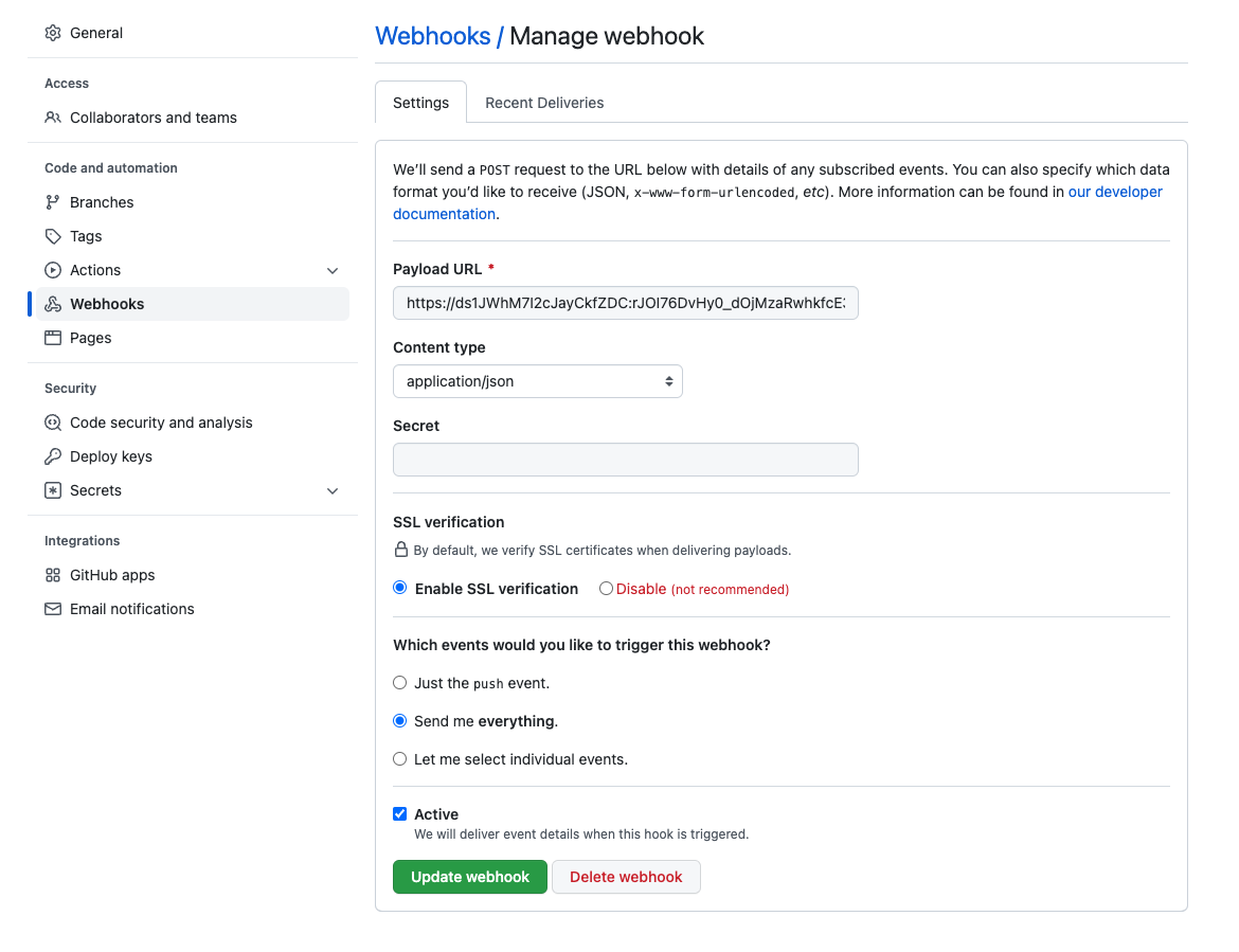 For more about GitHub Webhooks, see Creating webhooks in the GitHub documentation.