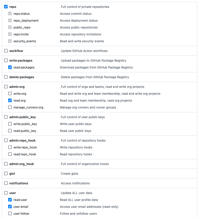 Define the scope for the token then click Generate token. Use the following scope to ingest all required data into Observe: