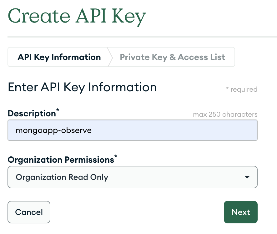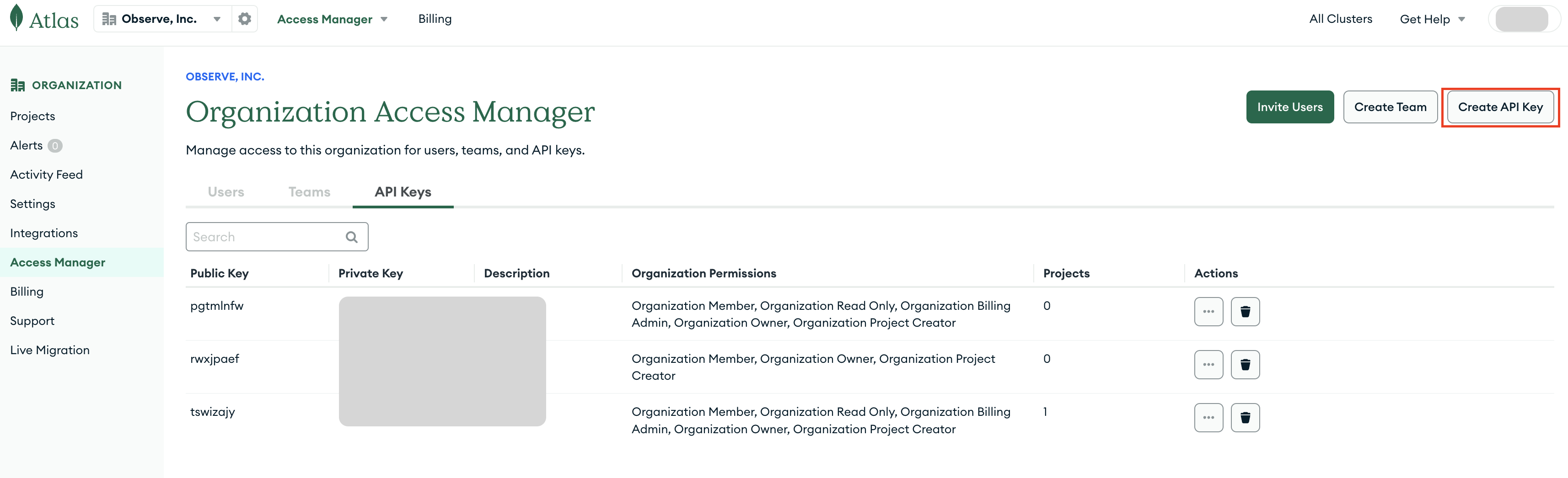 To allow the poller to access the Atlas Administration API, create an Organization API Key