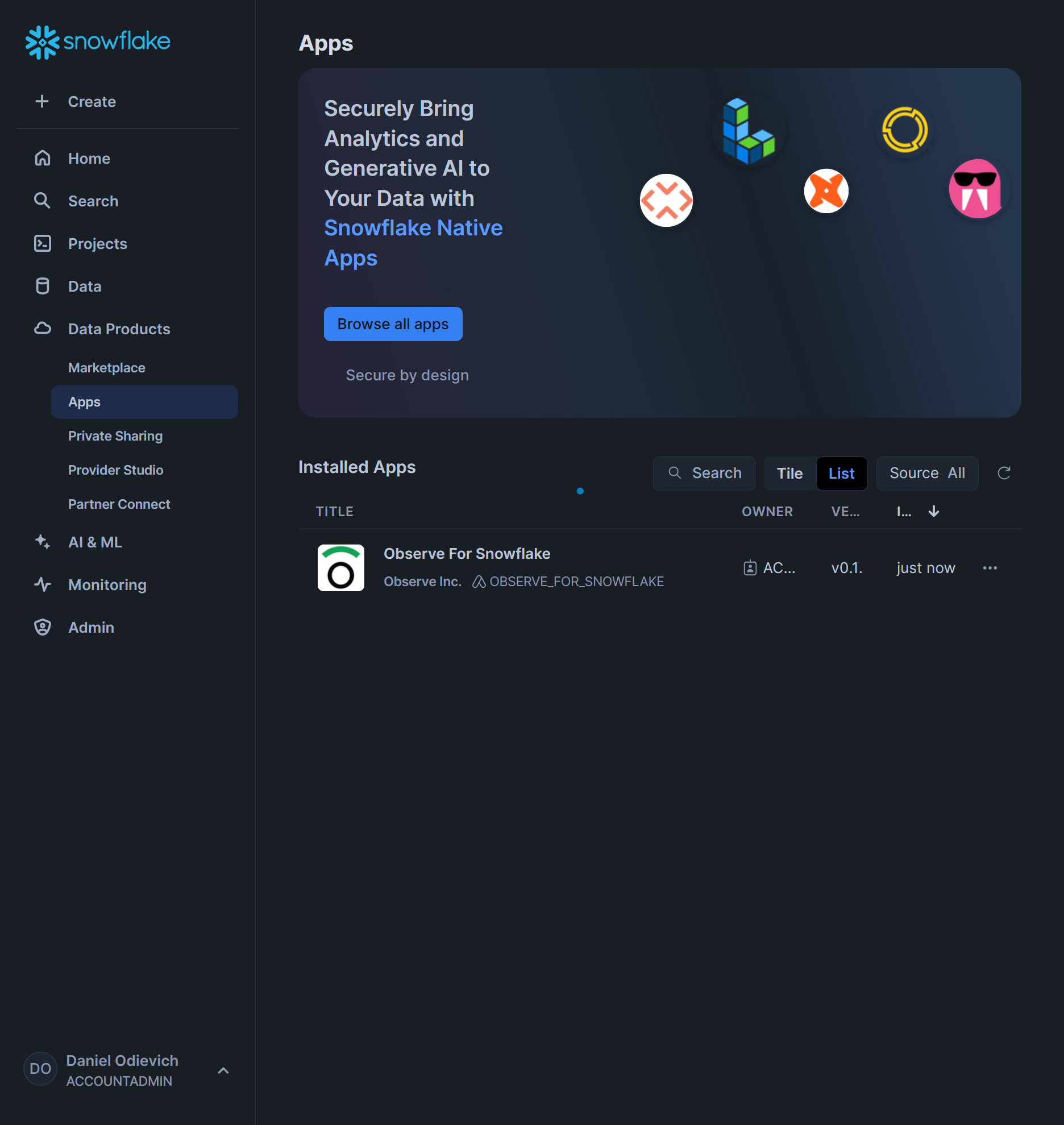 - When installed, the application should show up in Data Products\Apps section in Snowsight: