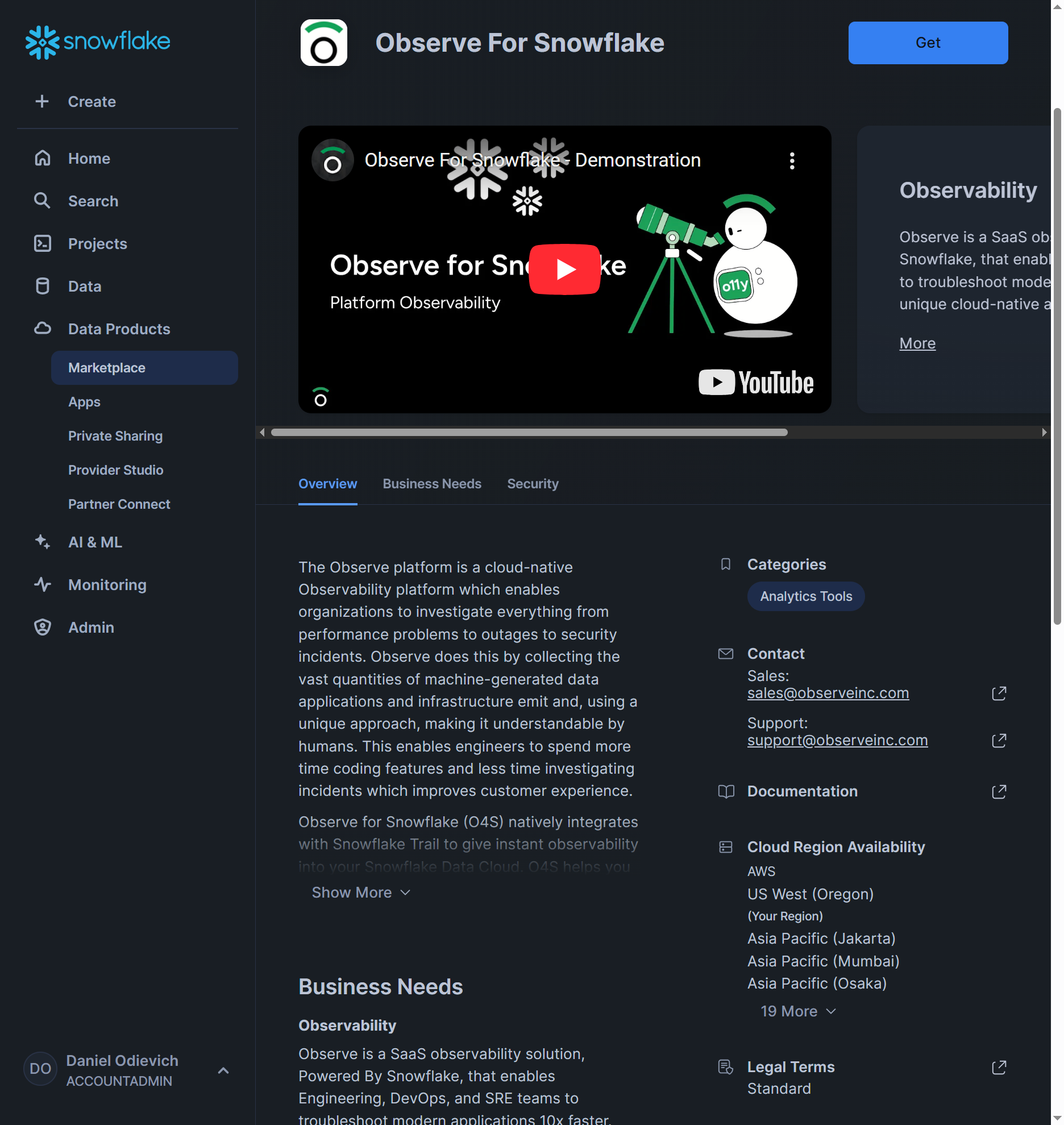 - Search for Observe for Snowflake and click on it.