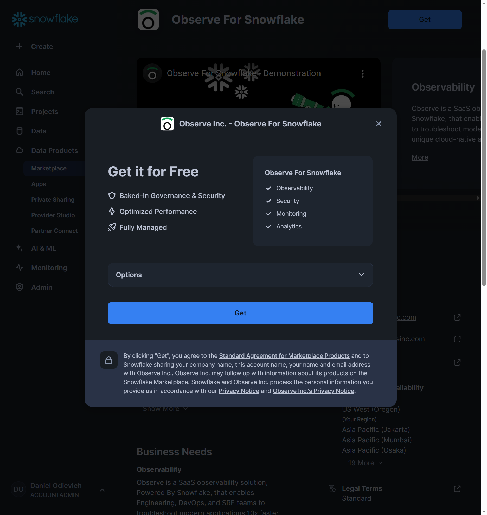 - Alternatively, you can.navigate to “Observe for Snowflake” listing https://app.snowflake.com/marketplace/listing/GZTYZY3AR0U/observe-inc-observe-for-snowflake: