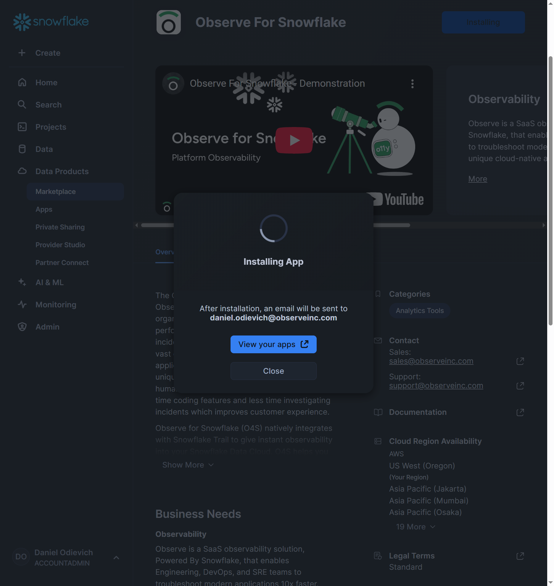 Install the Observe for Snowflake app