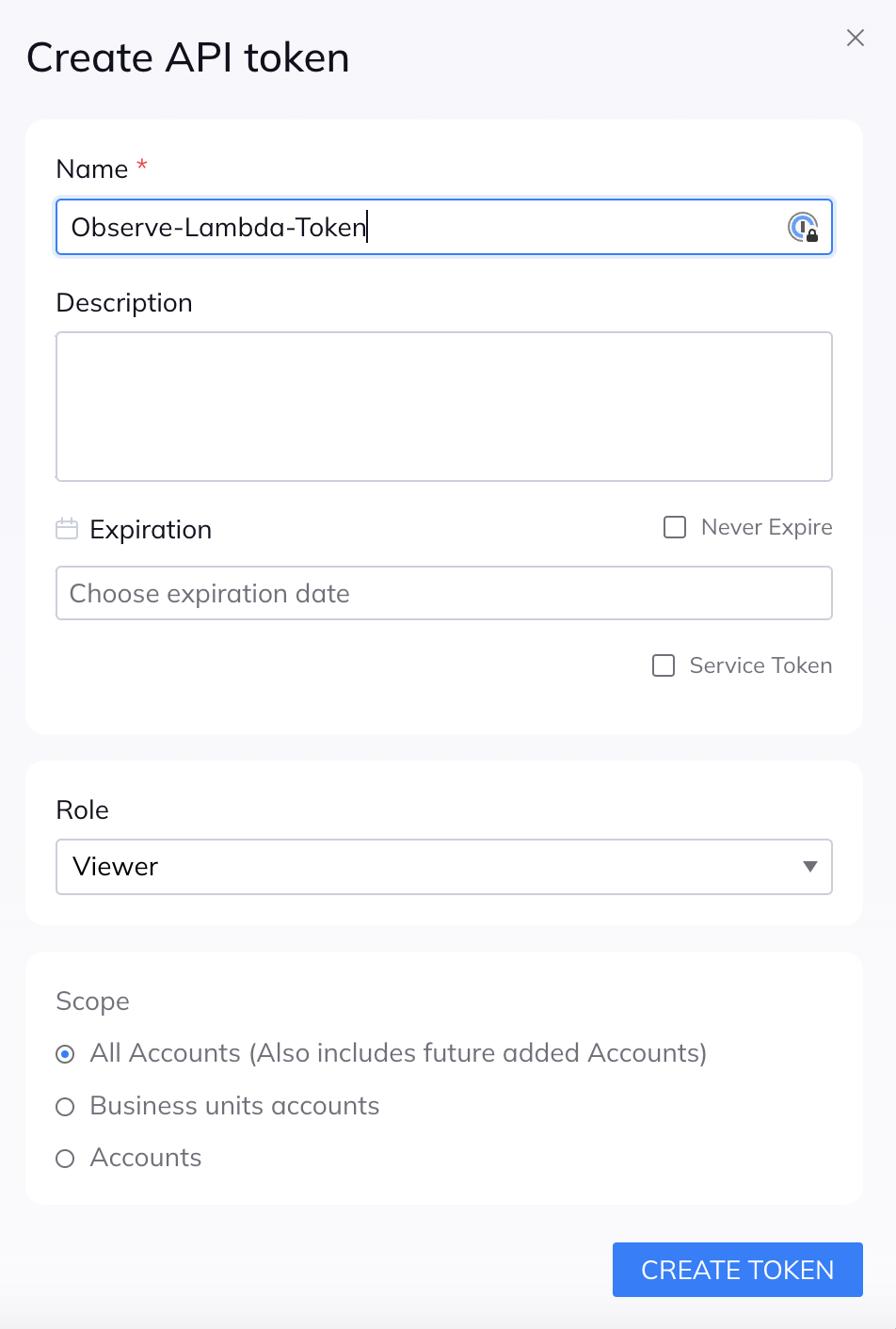 - Name the new API token, for example, Observe-Lambda-Token, and select a desired expiration date. When a token expires, you must update the integration.