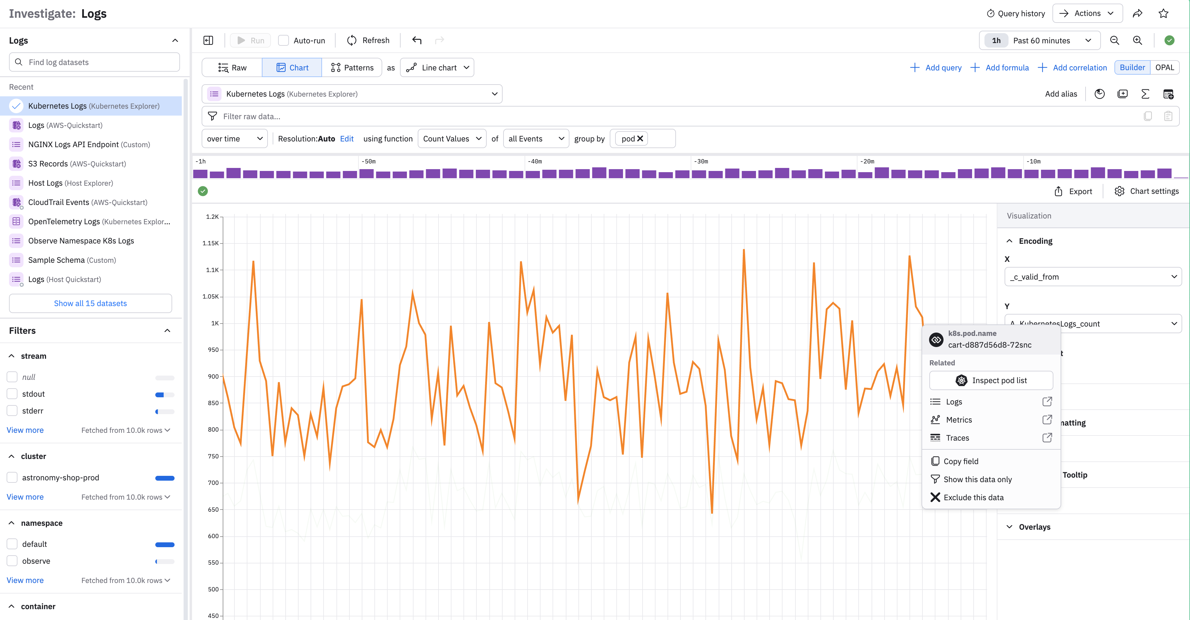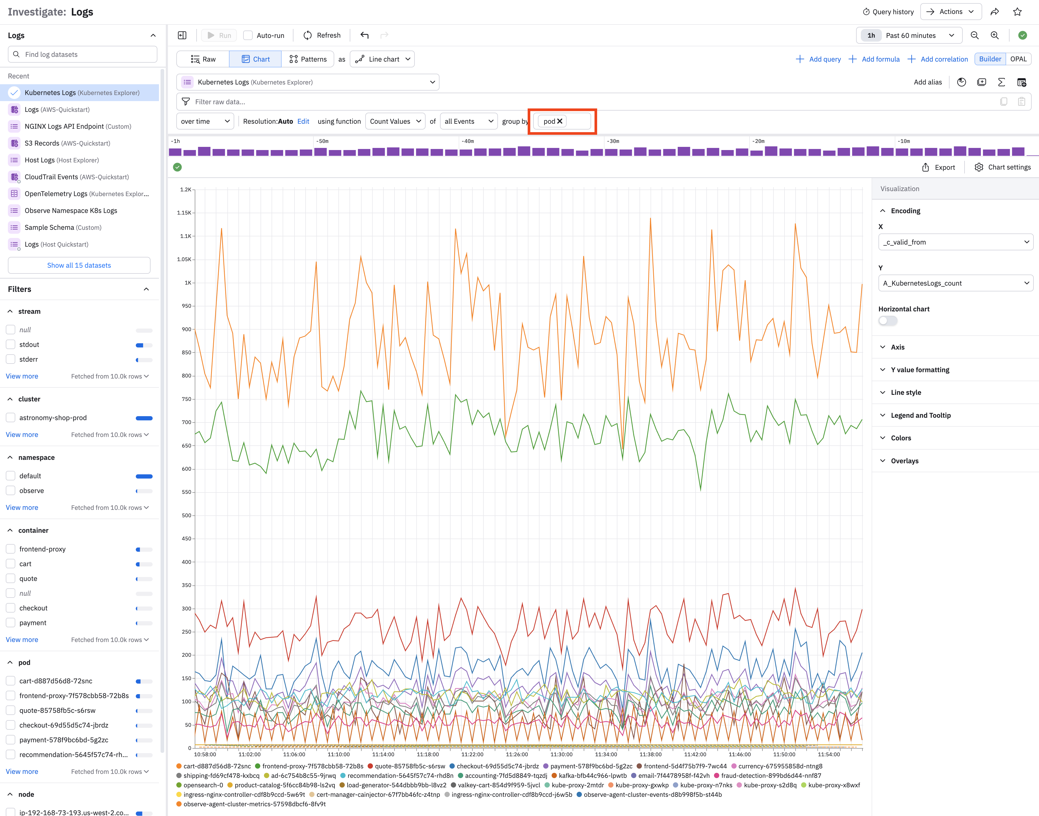 - In the Find log datasets field, enter Kubernetes, and select Kubernetes Logs from the search results.