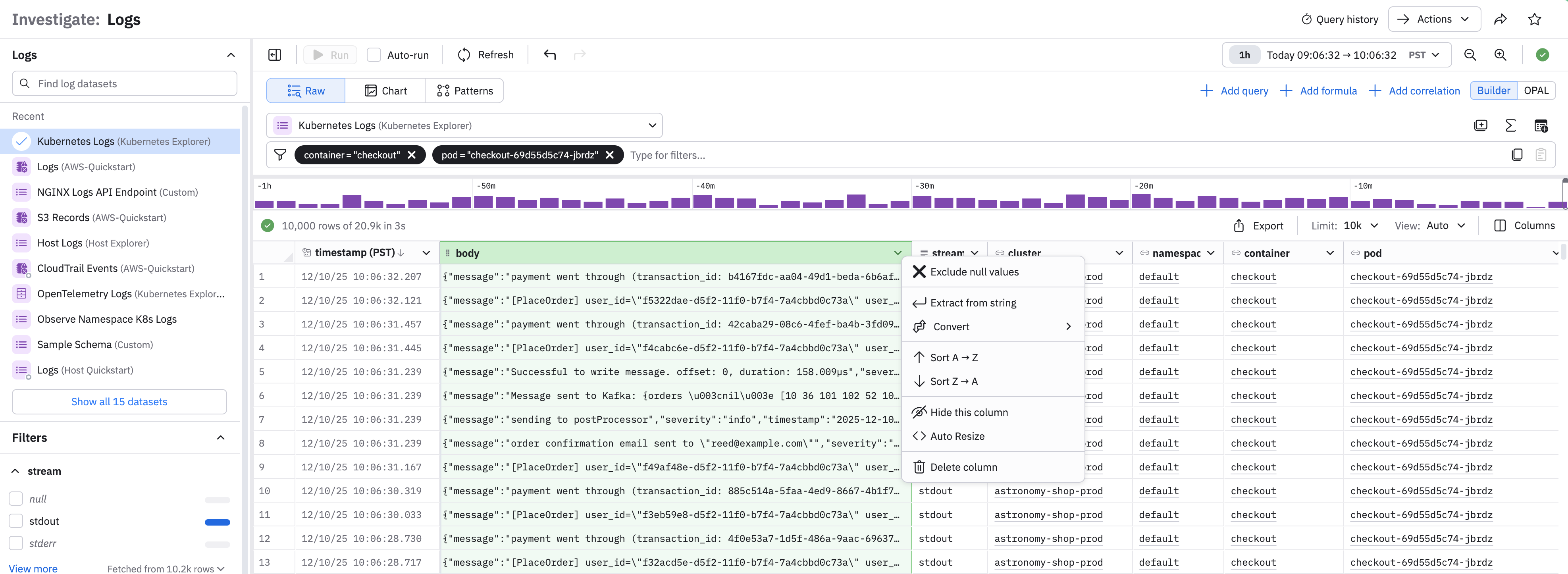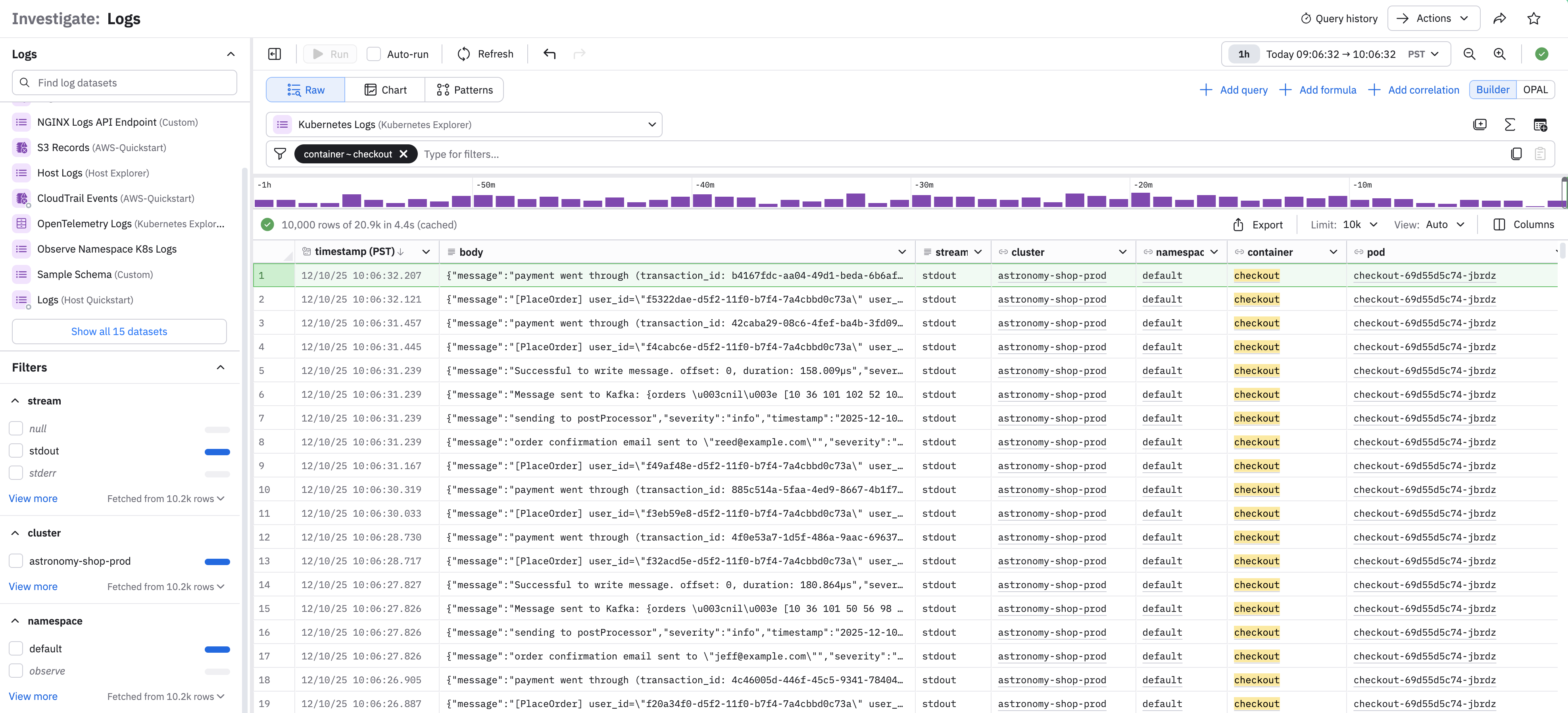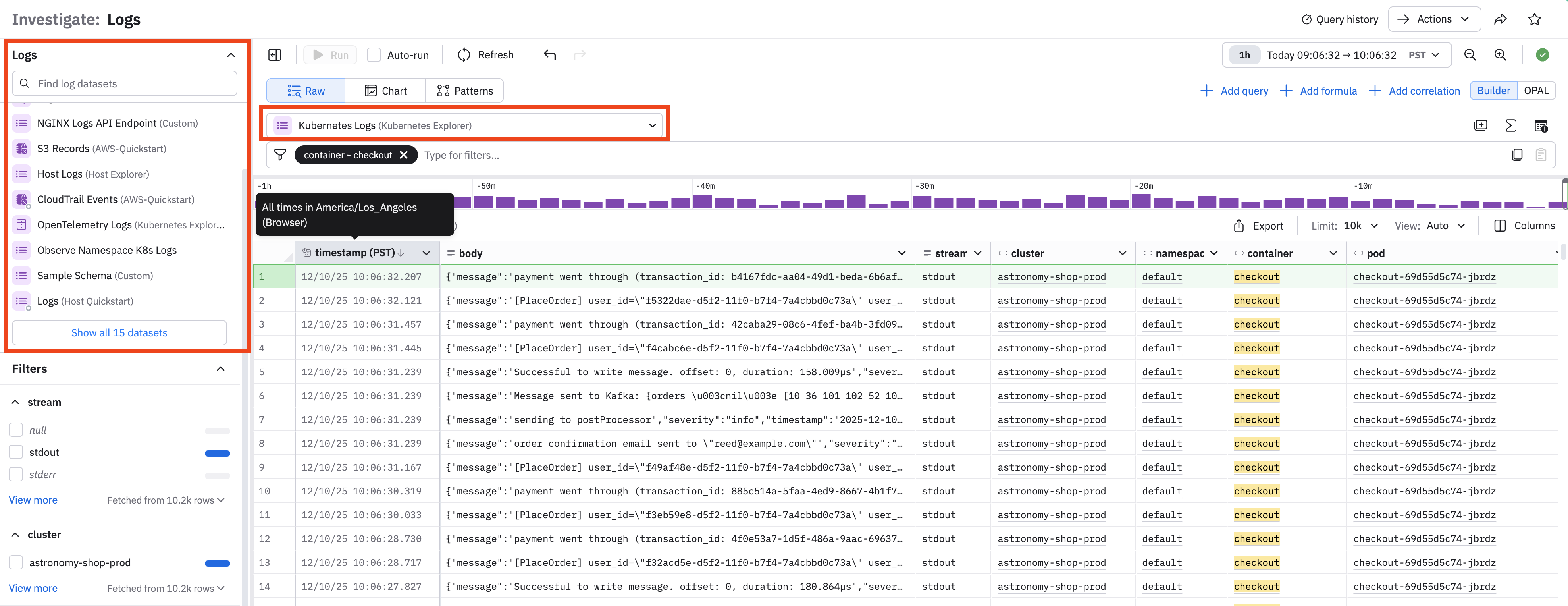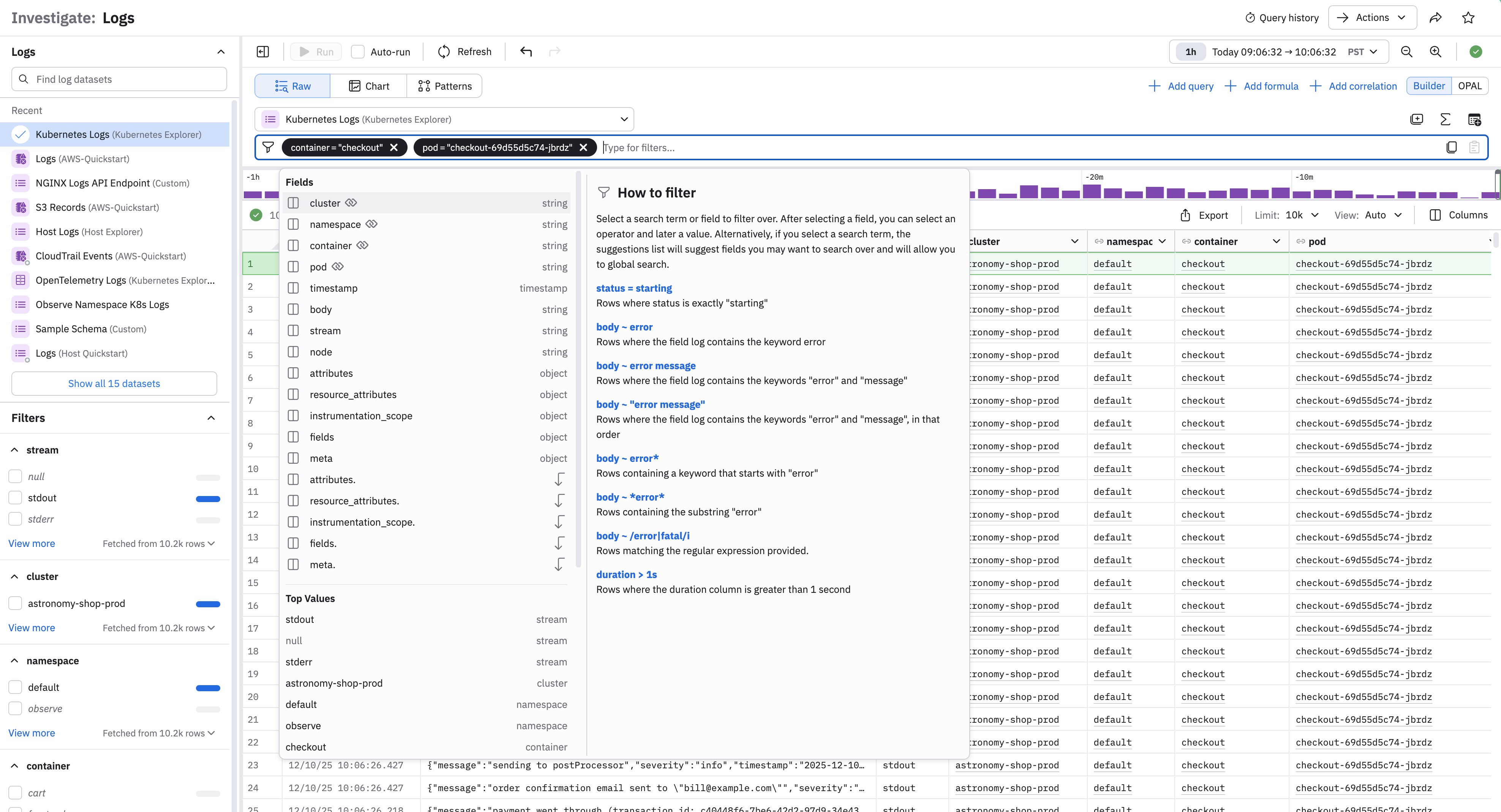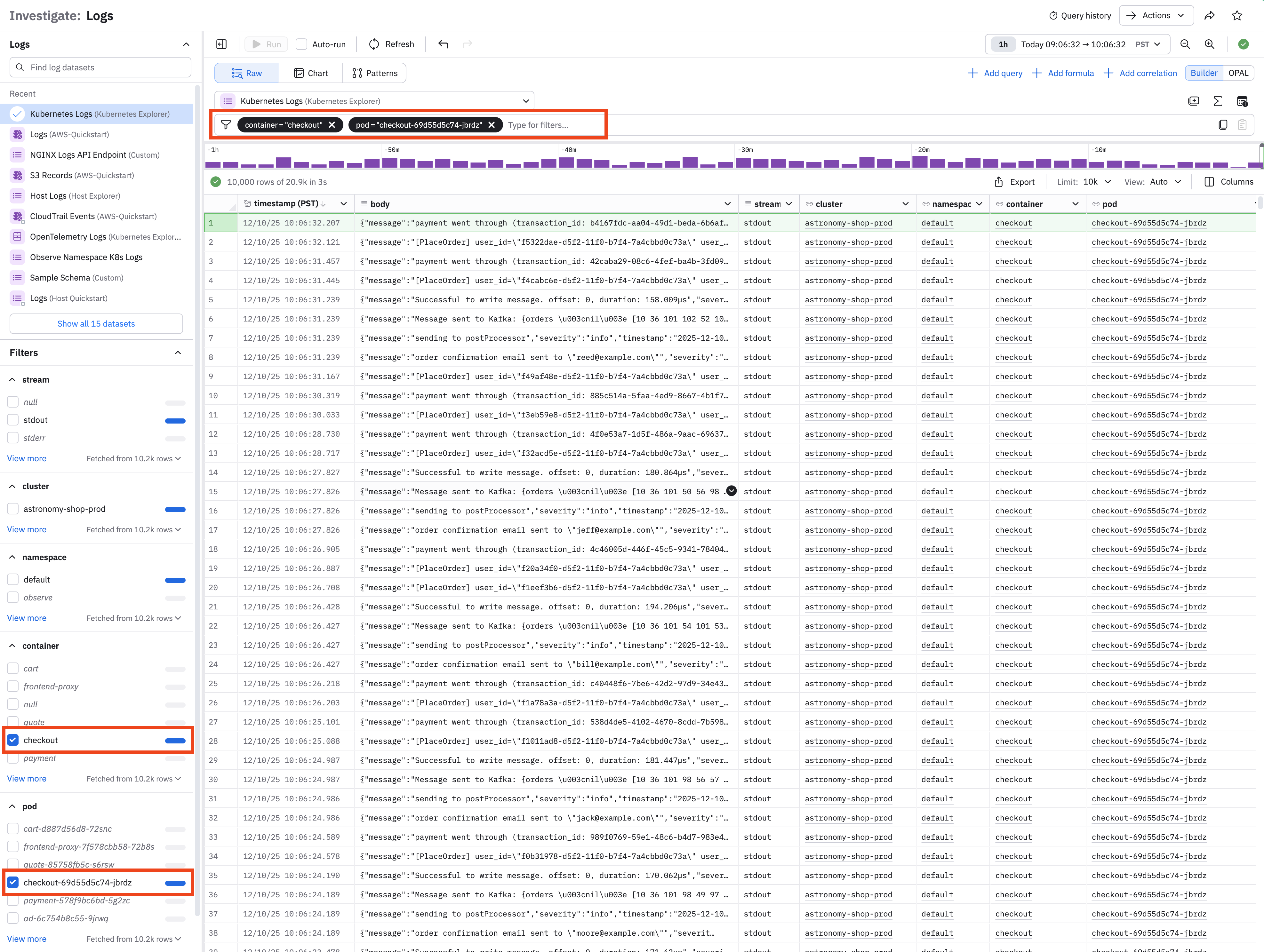 - In the Filter field, enter container ~ checkout. This filters entries in the Kubernetes Logs Dataset to only those with checkout in the container column.