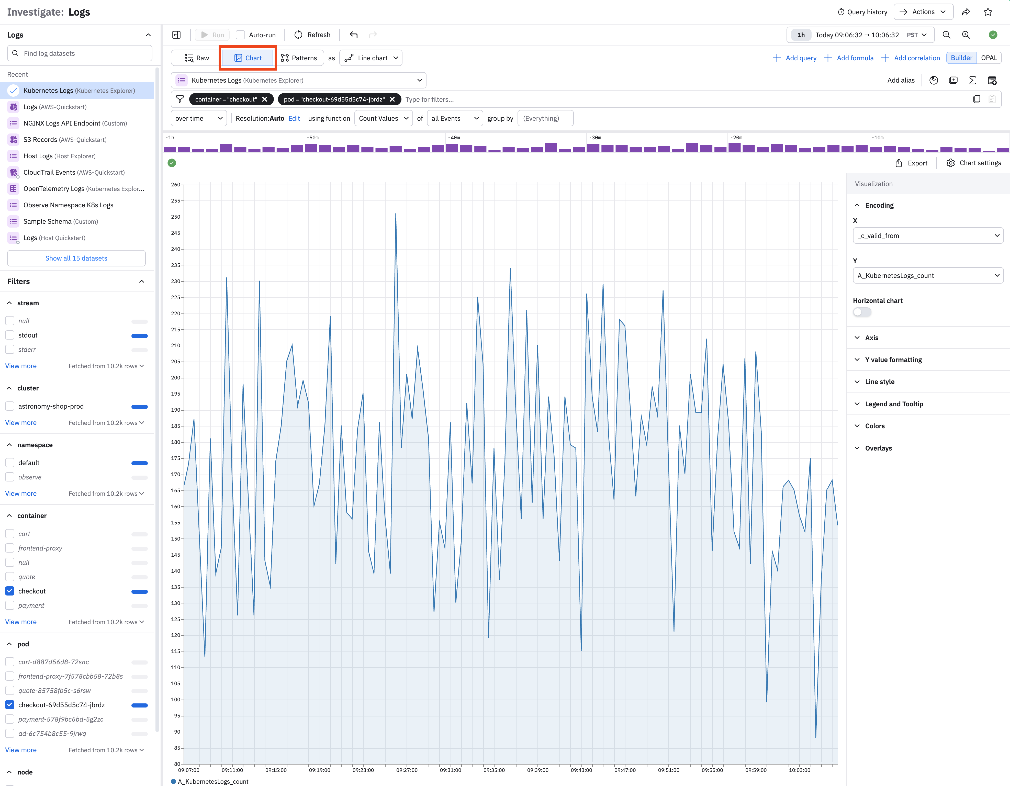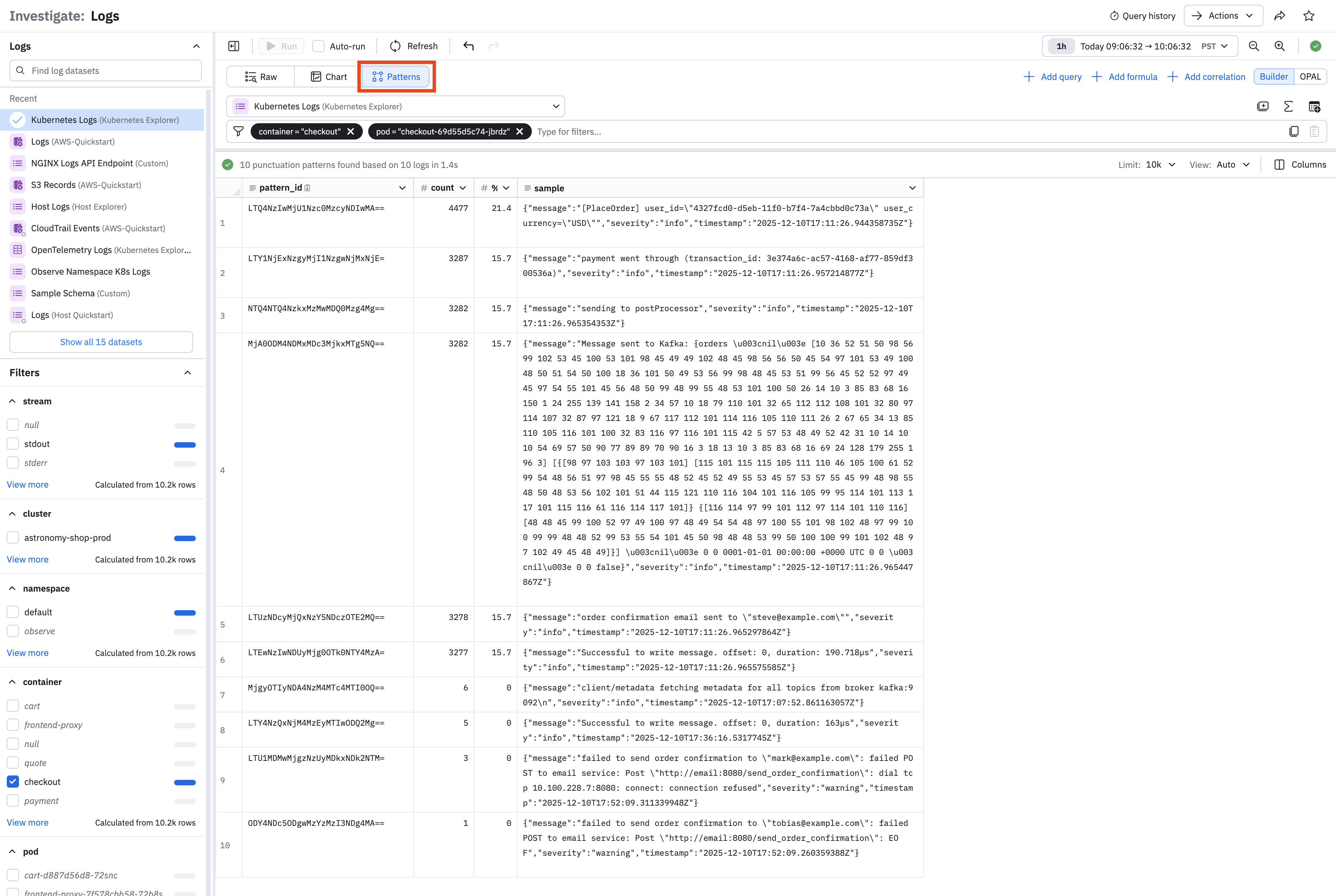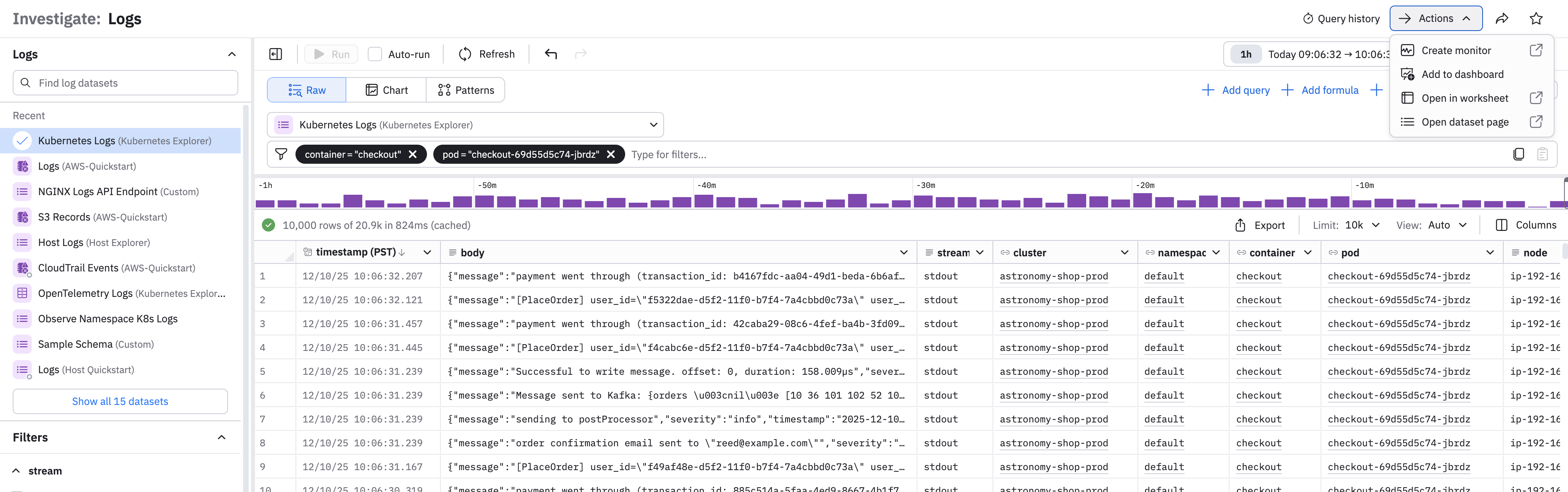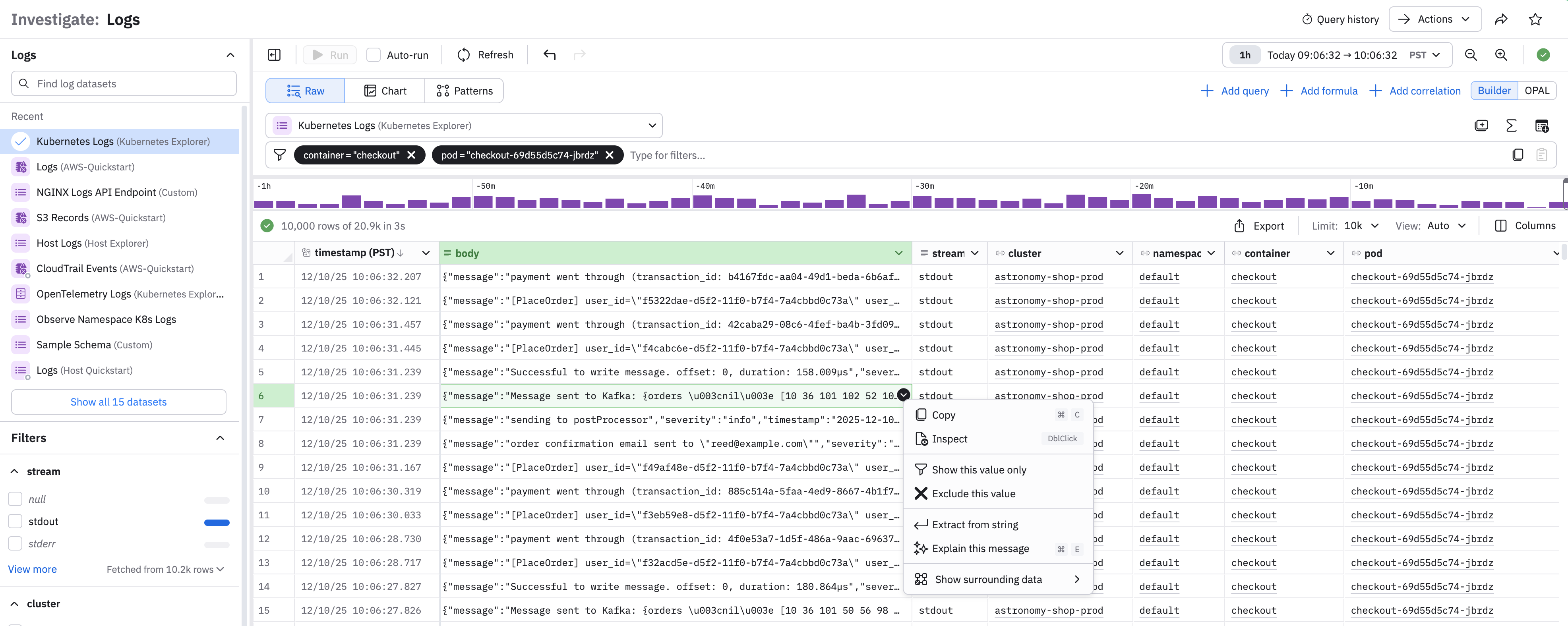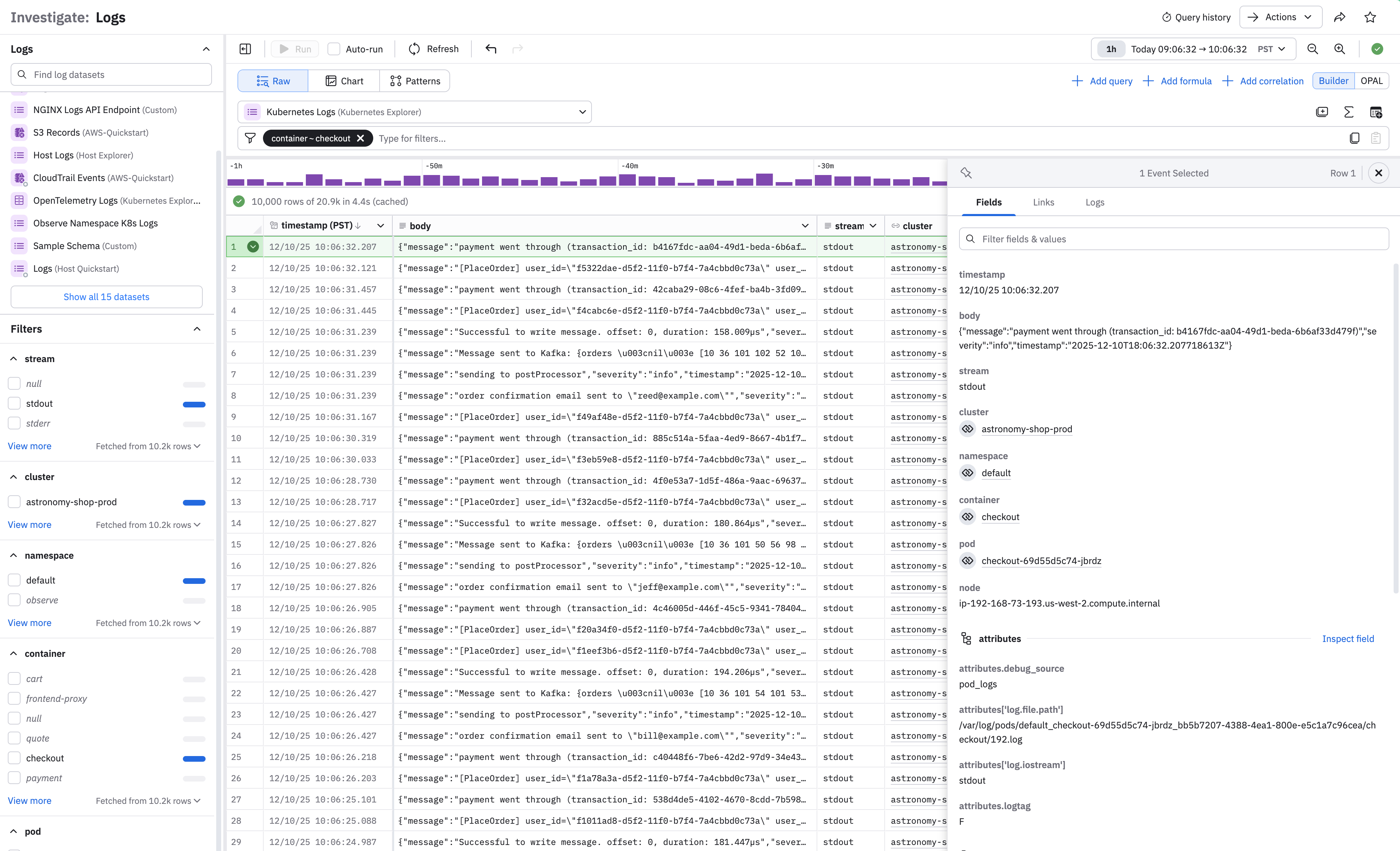 - In the Filter field, enter container ~ checkout. This filters entries in the Kubernetes Logs Dataset to only those with checkout in the container column.