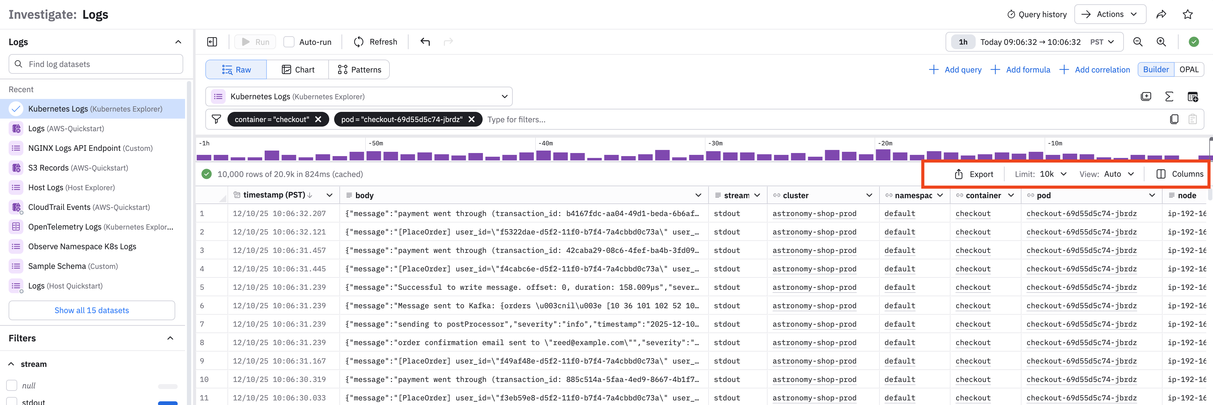 Click Export to download the data displayed in Log Explorer in CSV or JSON format. You can specify a maximum size limit (one thousand, ten thousand, or one hundred thousand rows). Note that hidden fields will be included. Use the pick_col OPAL verb to reduce the width of downloaded data.