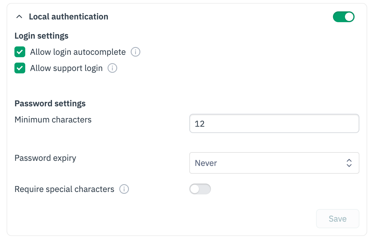 Select Settings > Workspace Settings > Customer Settings, then expand the Local authentication section.