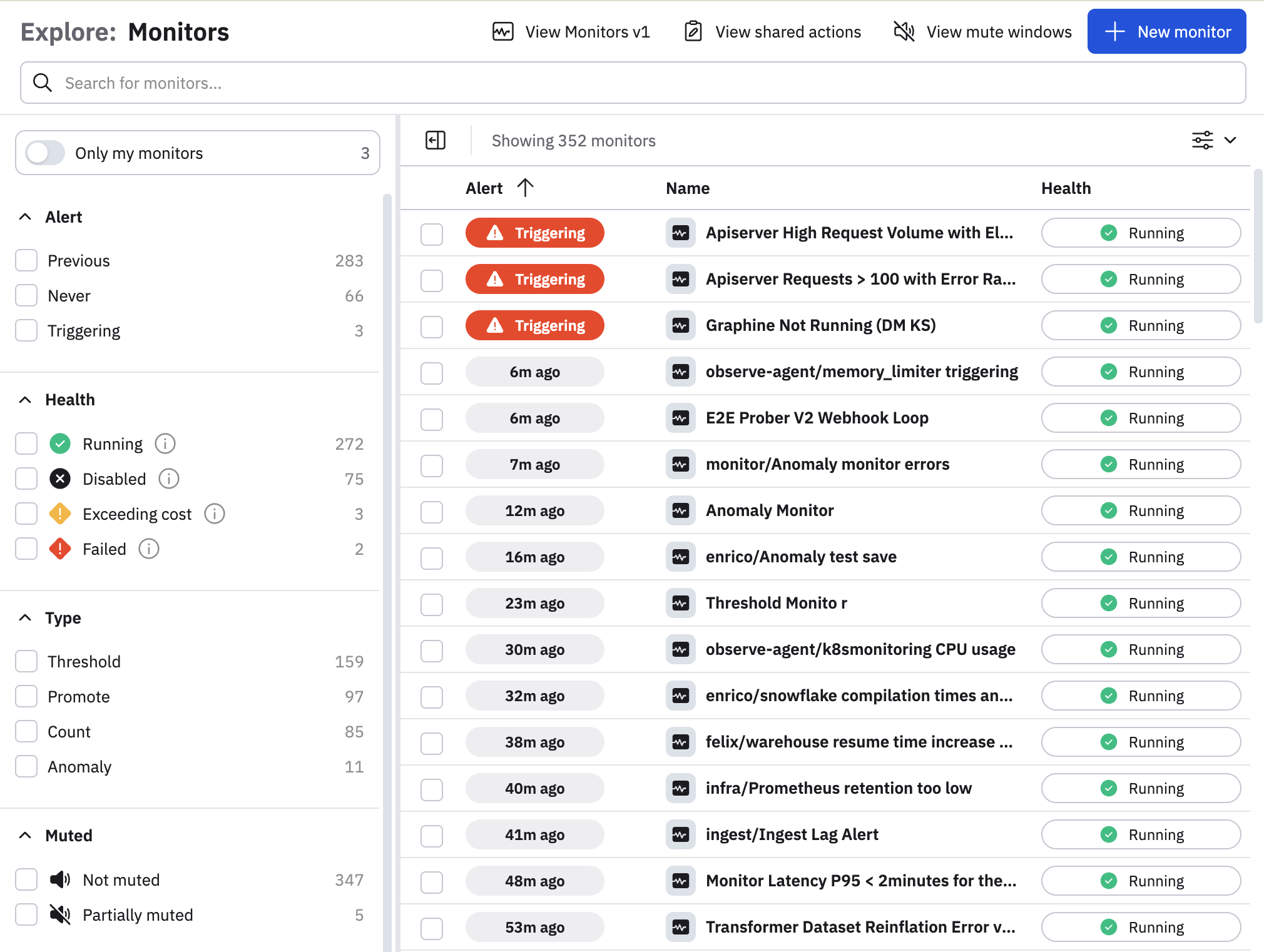 You can access v1 Monitors, Shared Actions, Mute Windows, and the New Monitor creation tool from the top right.