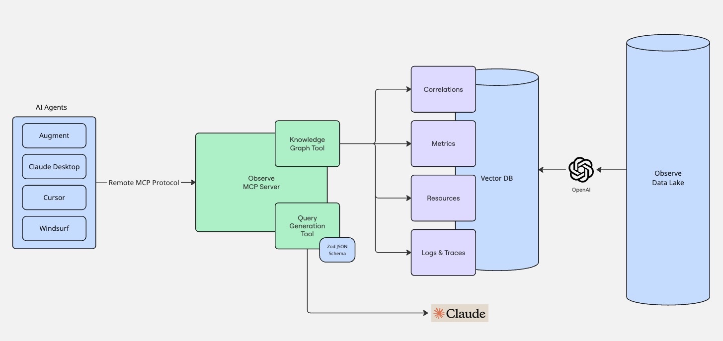 The Observe MCP Server lets agentic tools such as Augment, Cursor, Claude Code, and Claude Desktop connect securely to your Observe tenant so they can investigate incidents, or explore logs, metrics or traces.