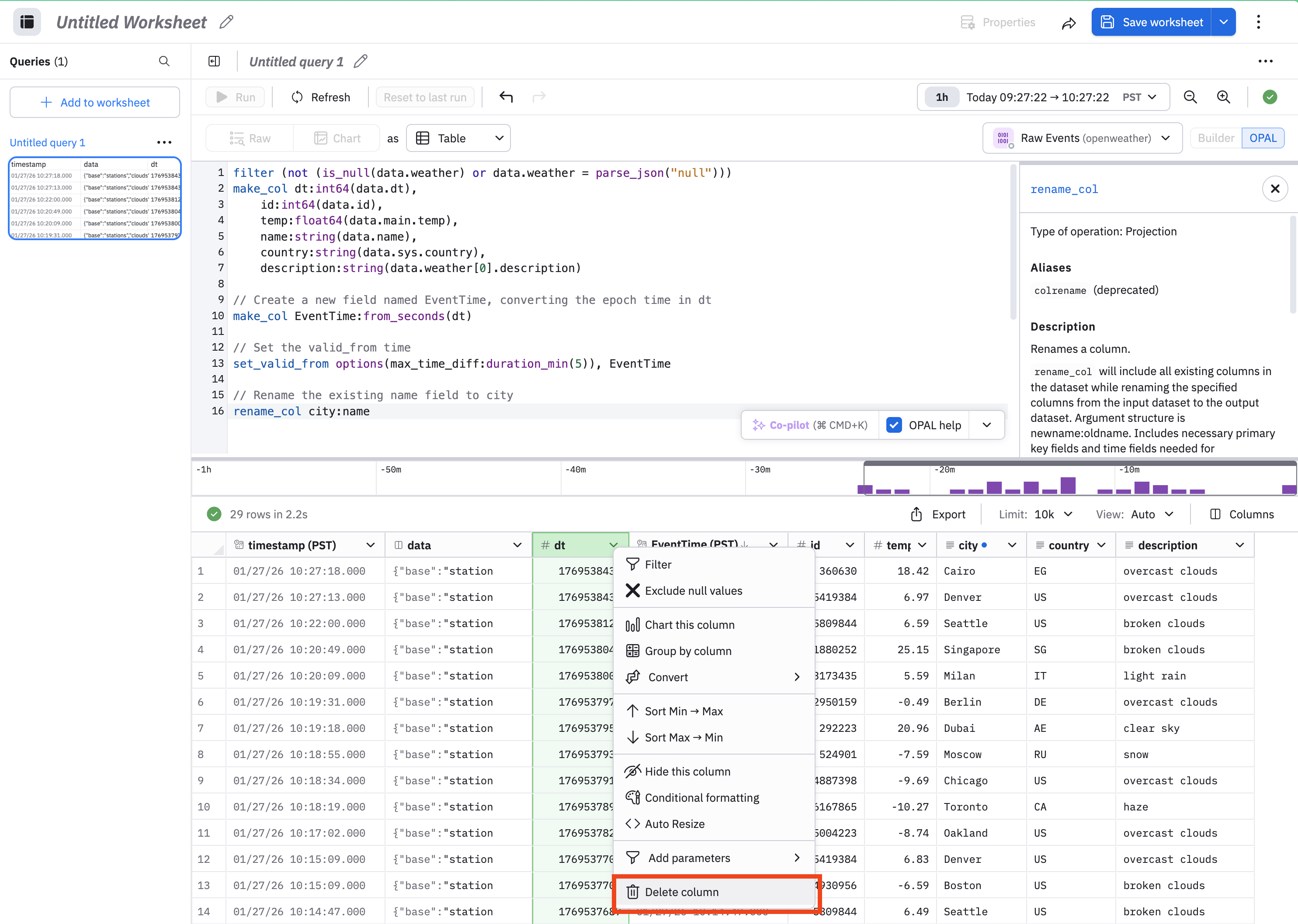 NoteThe Dataset must have a valid timestamp, so don't drop the timestamp field. The UI won't show the Delete column menu item for that field, and the OPAL console displays an error if you try to do it with