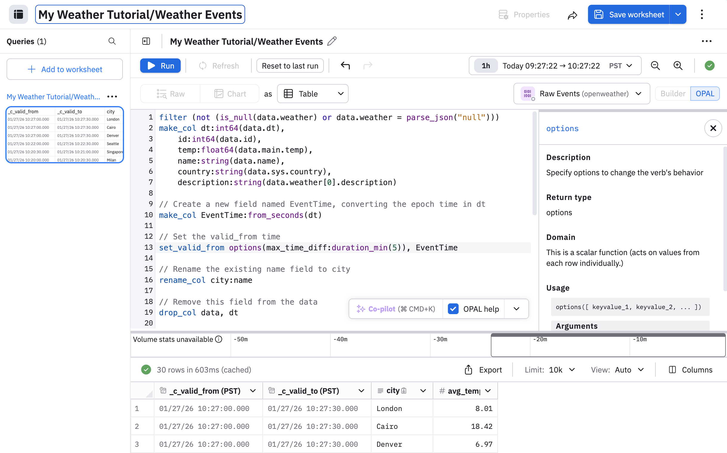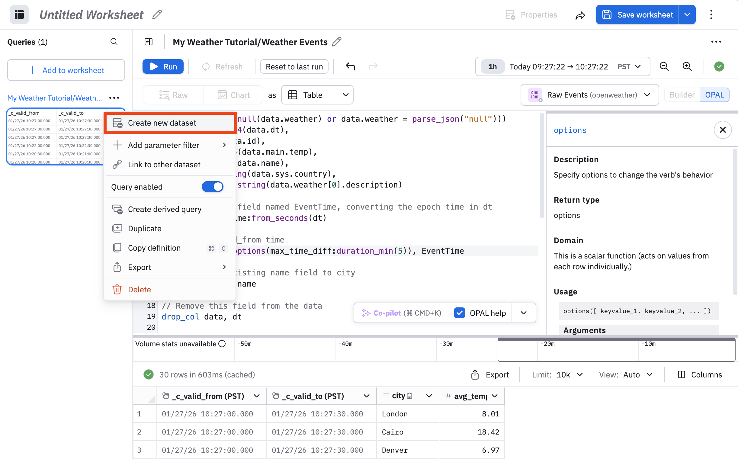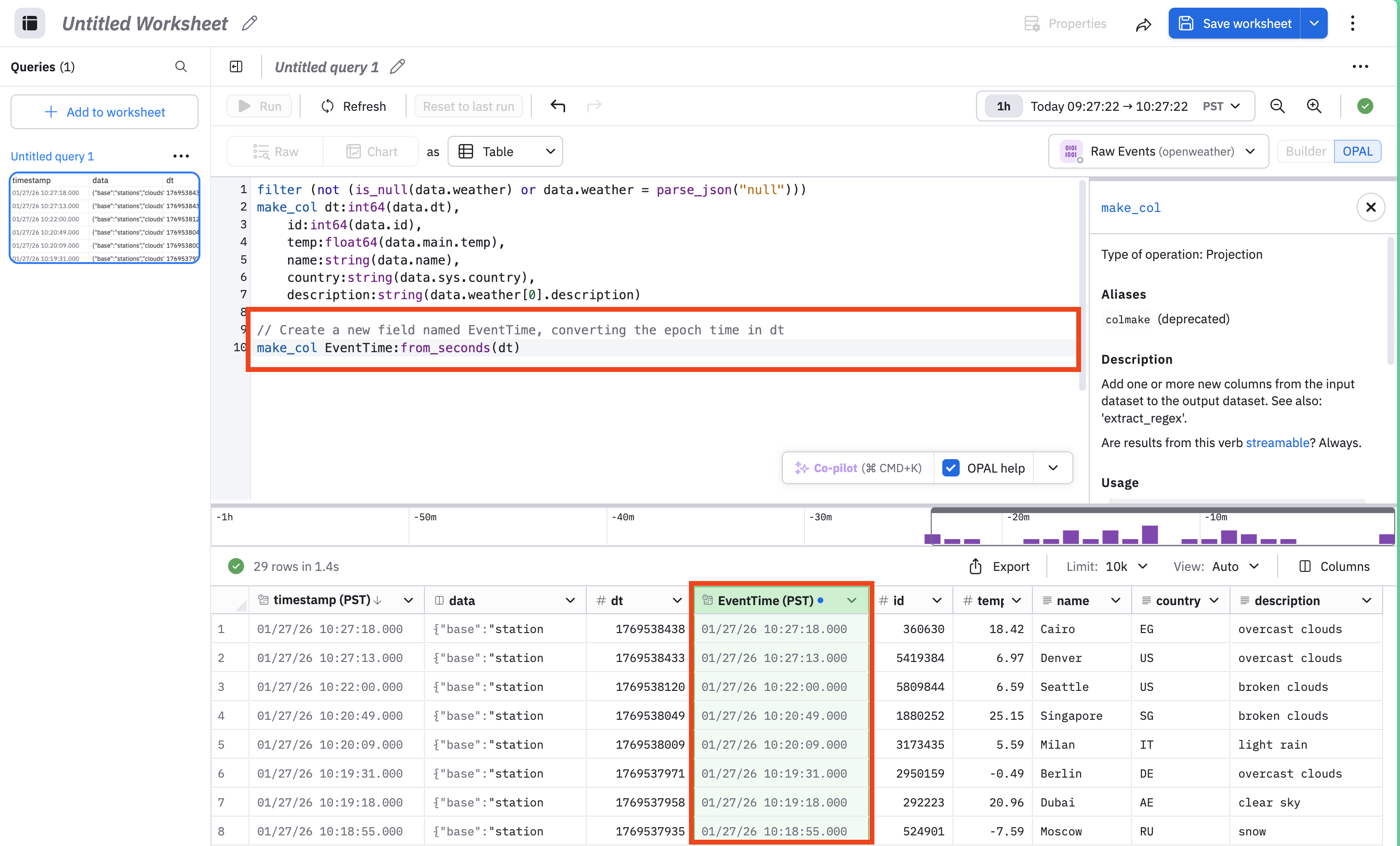 This now sets the newly created field EventTime as your event timestamp, by using the set_valid_from OPAL verb. Note that the OpenWeather Dataset's dt time values are close to the poller ingestion time seen in the raw Dataset. When dealing with your own data, if you need to specify a time value other than when Observe ingested it, don't use a value that deviates too far from the original ingest time, as it can impact performance. See set_valid_from for details.