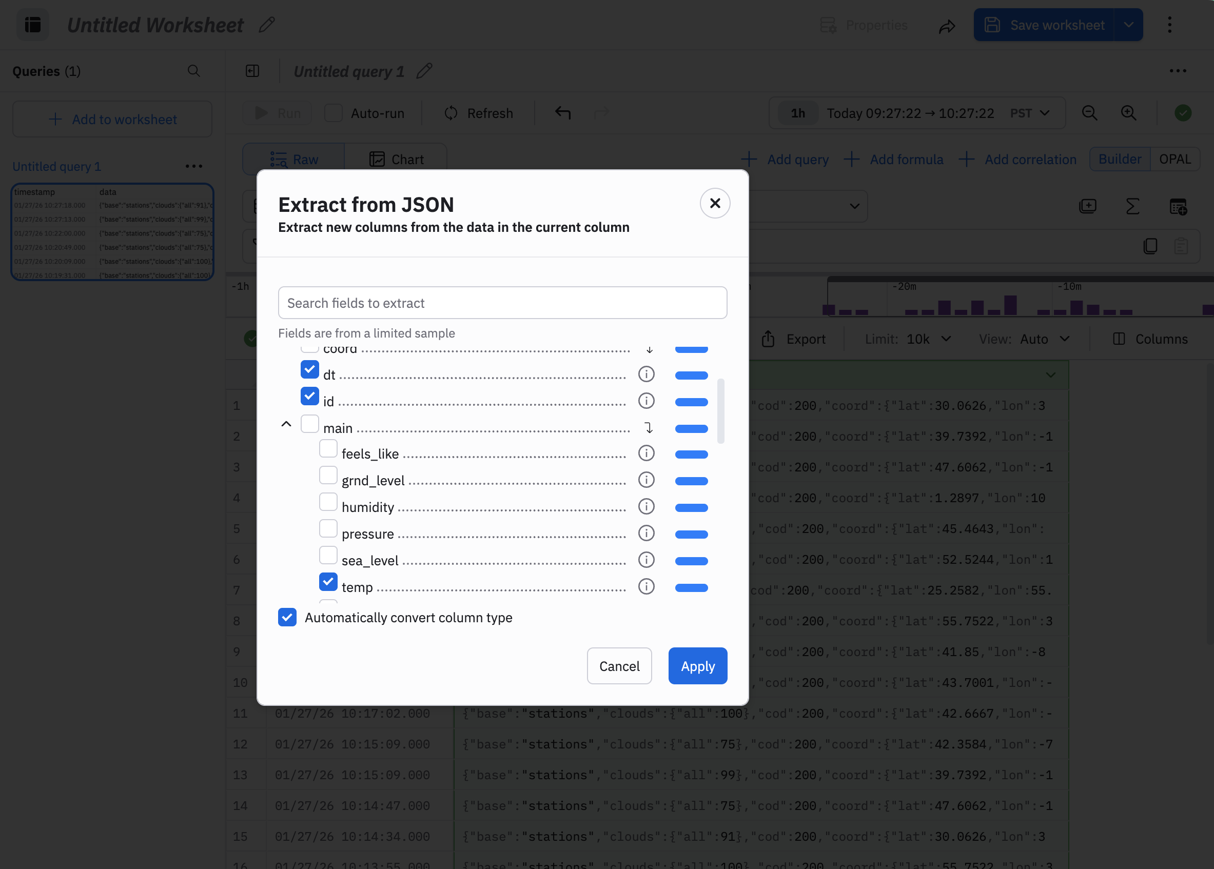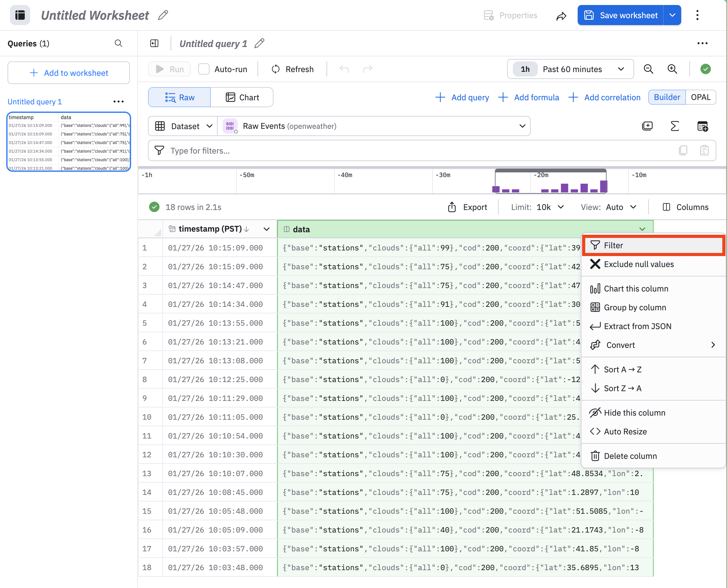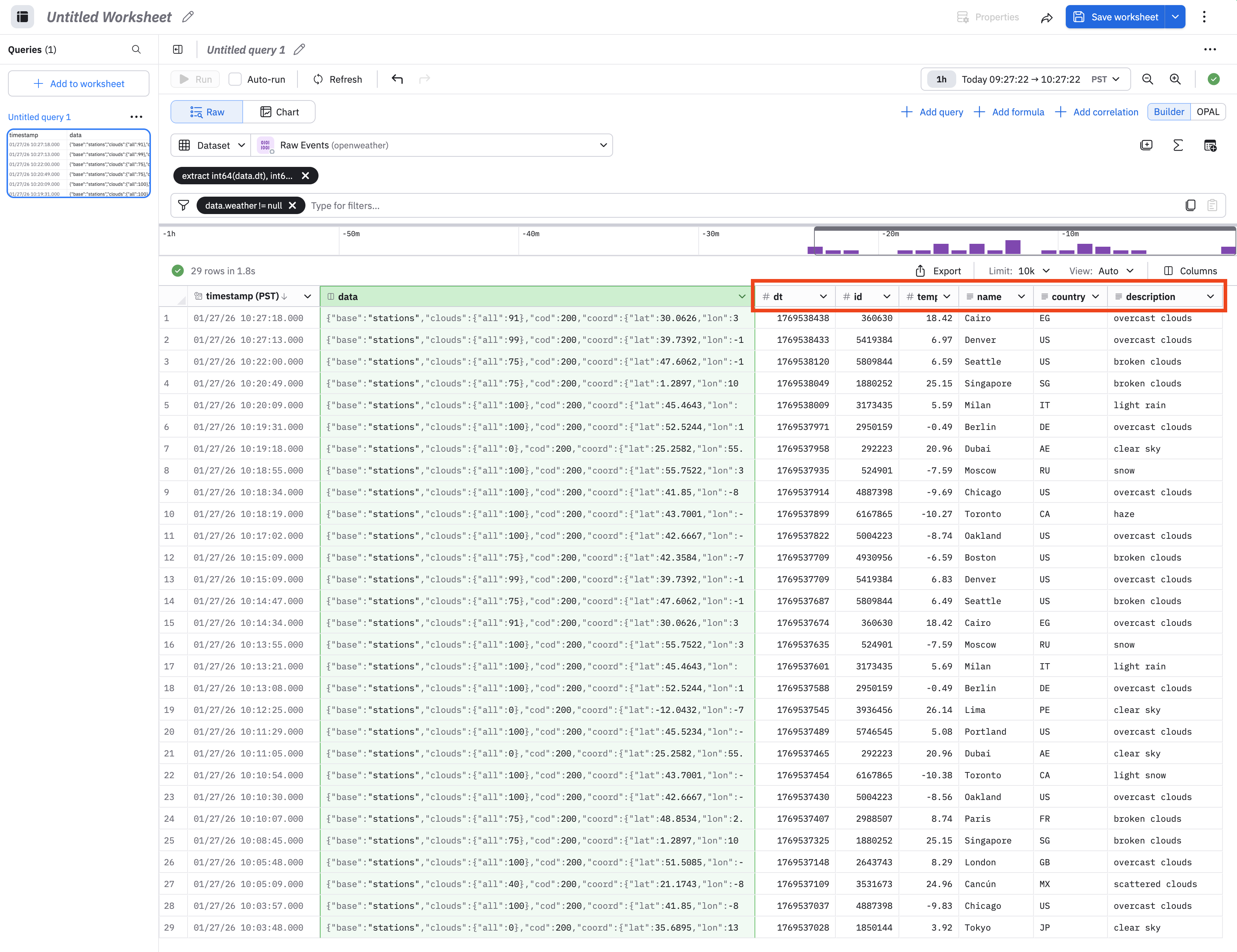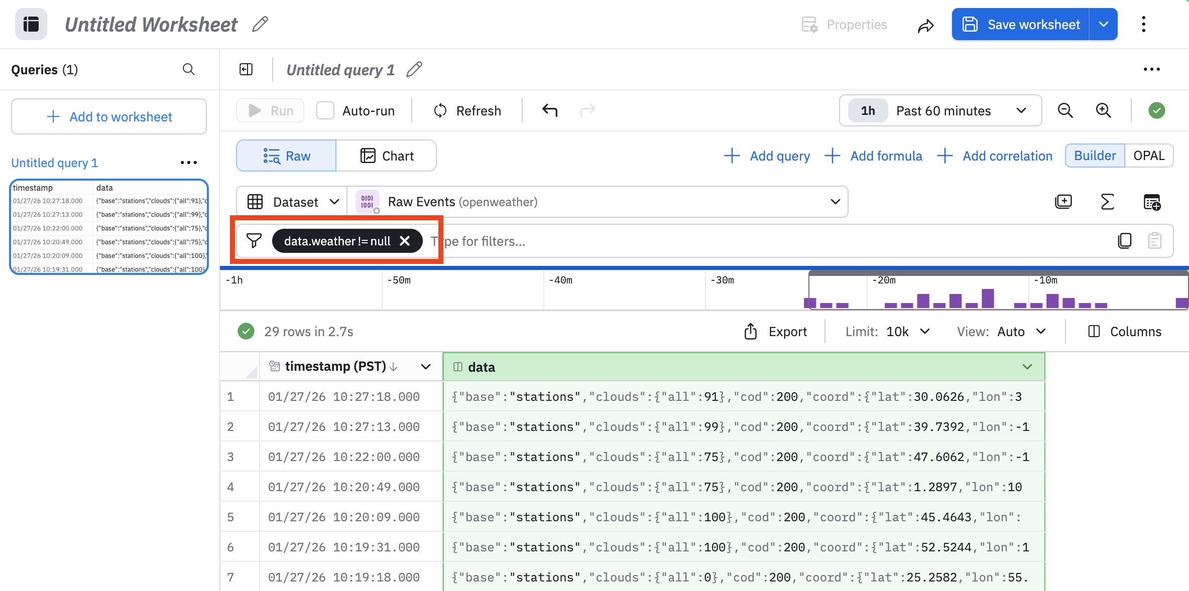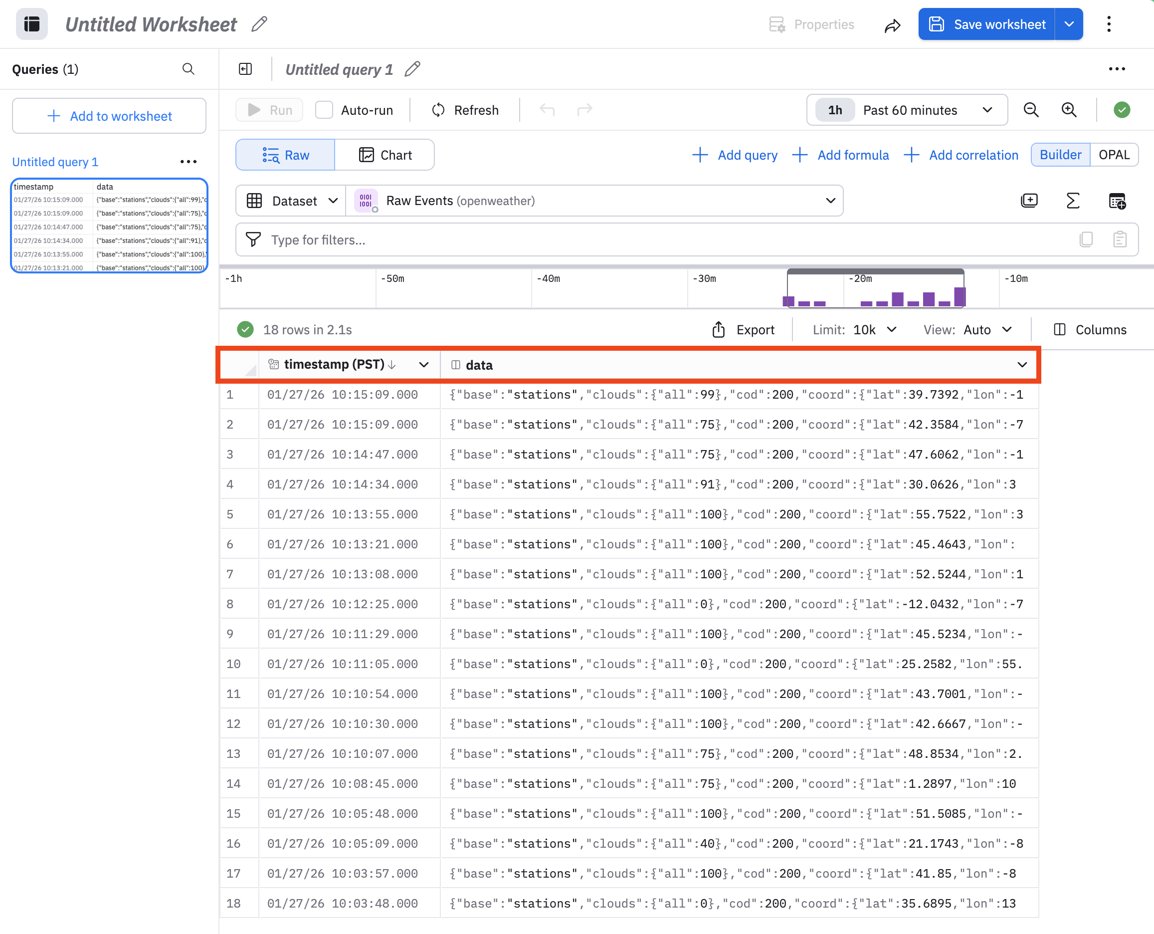 The OpenWeather app presents collected weather information in the Raw Events Dataset. We will use this Dataset to get acquainted with Worksheets.