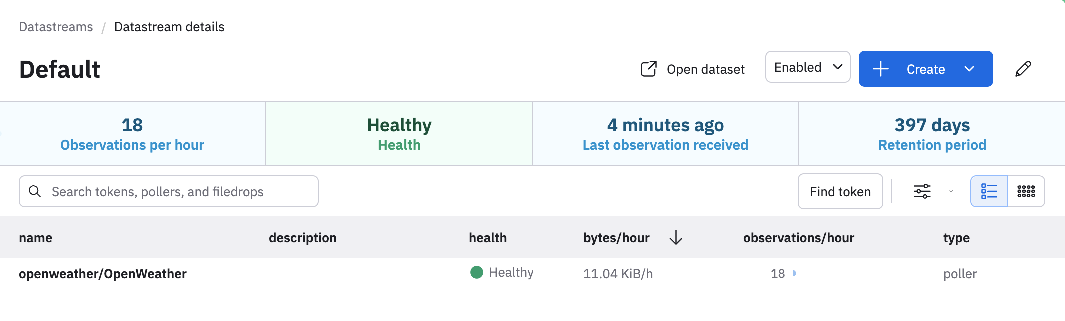 These Datasets are derived from a Datastream. When you ingest OpenWeather data, the data initially goes into the Default Datastream. This Datastream contains all the raw, unshaped data ingested into your workspace by the OpenWeather app. The app also includes a Poller that pulls new observations (events) to the Datastream regularly by polling the OpenWeather API. We will take the raw data from the Datastream and shape it into distinct Datasets.