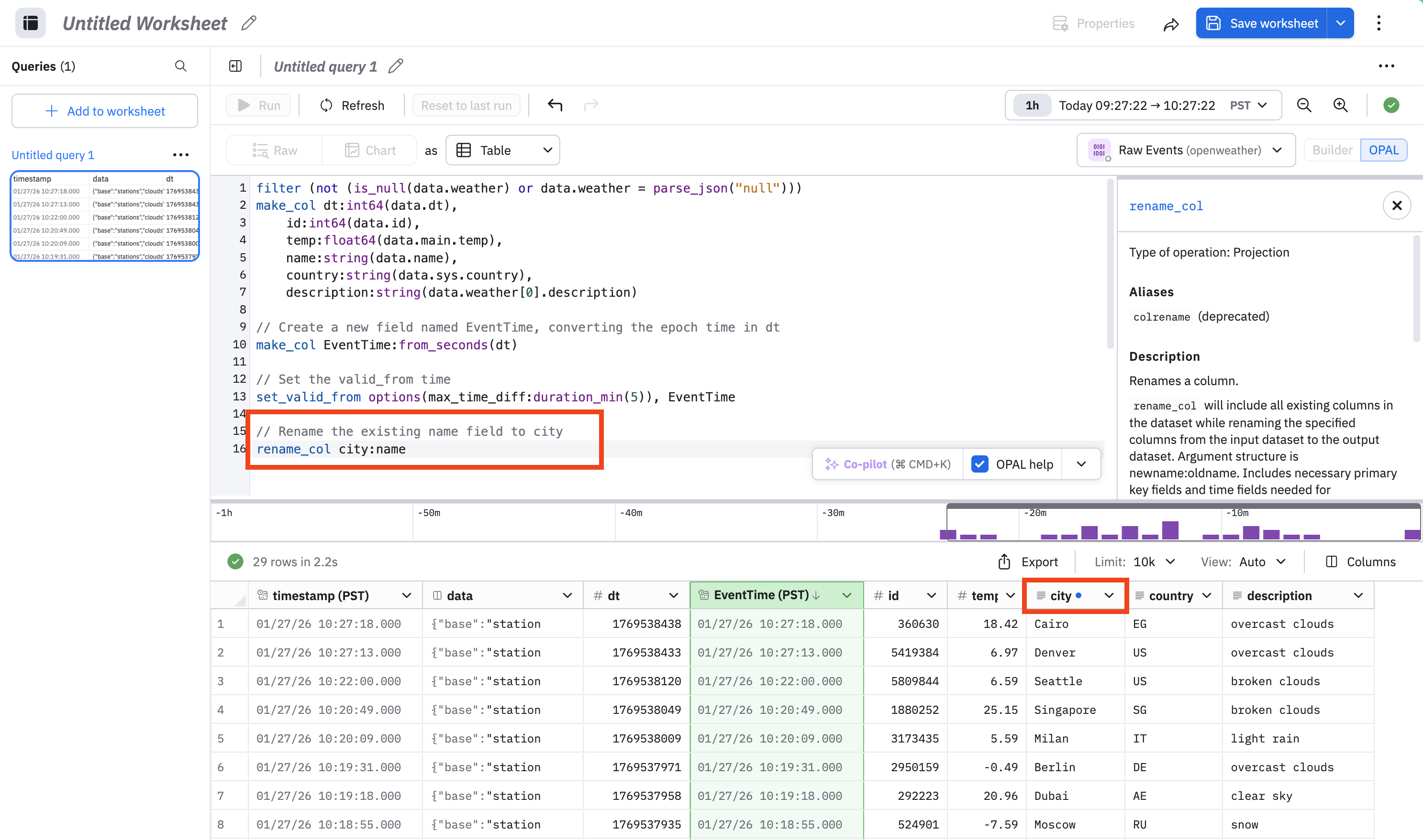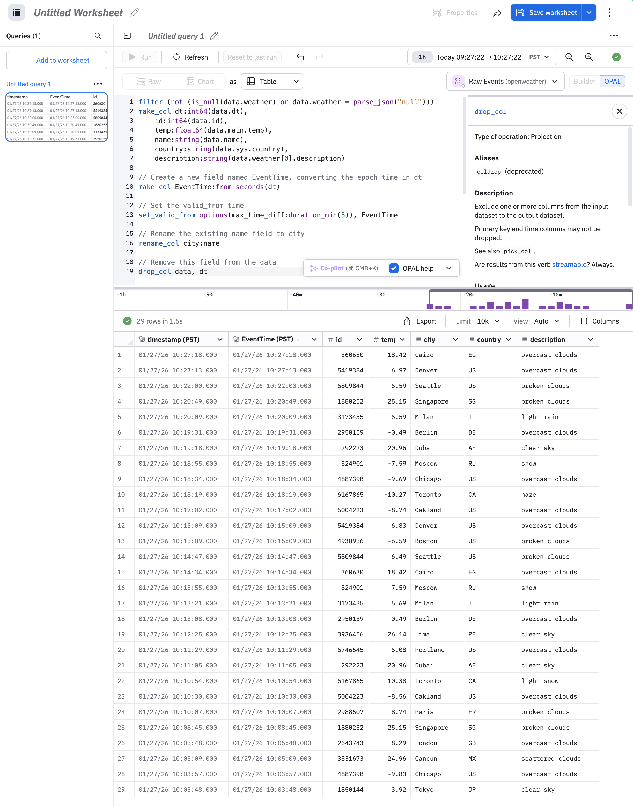 pick_col EventTime, timestamp, id, city, description, temp, country