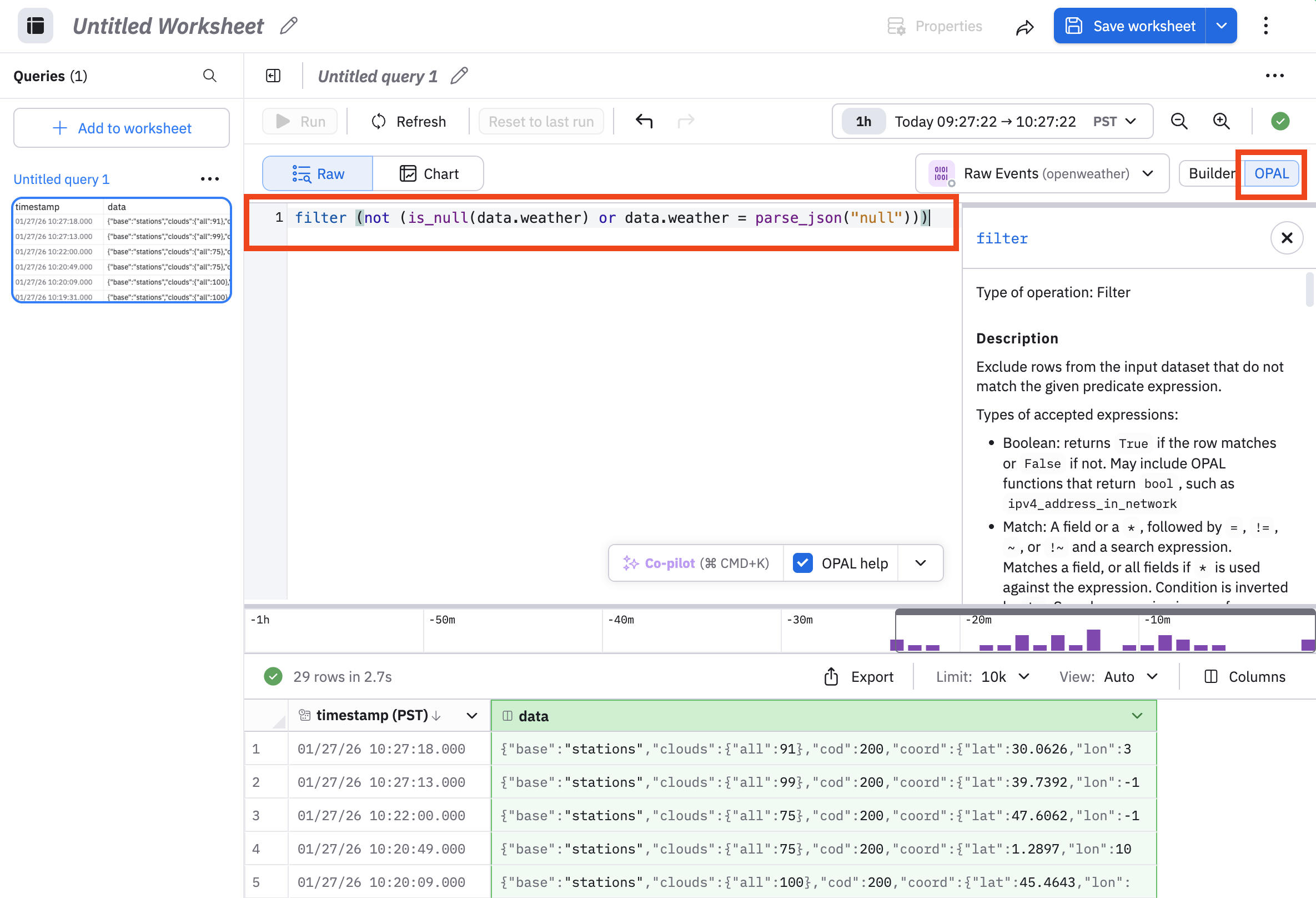 The UI generates this for you. Click OPAL to open the Console, you will see that OPAL has also been generated for this filtering task.