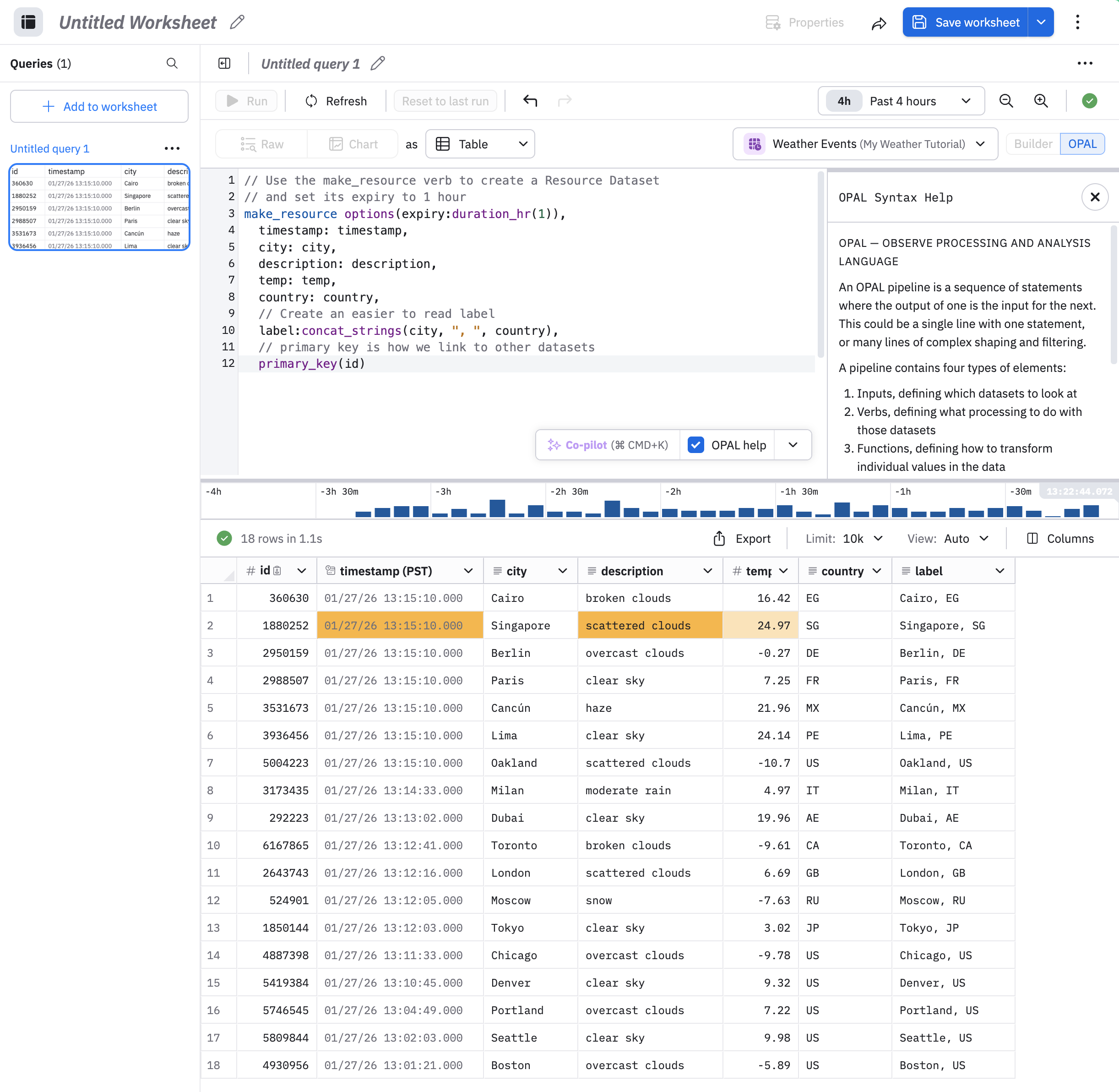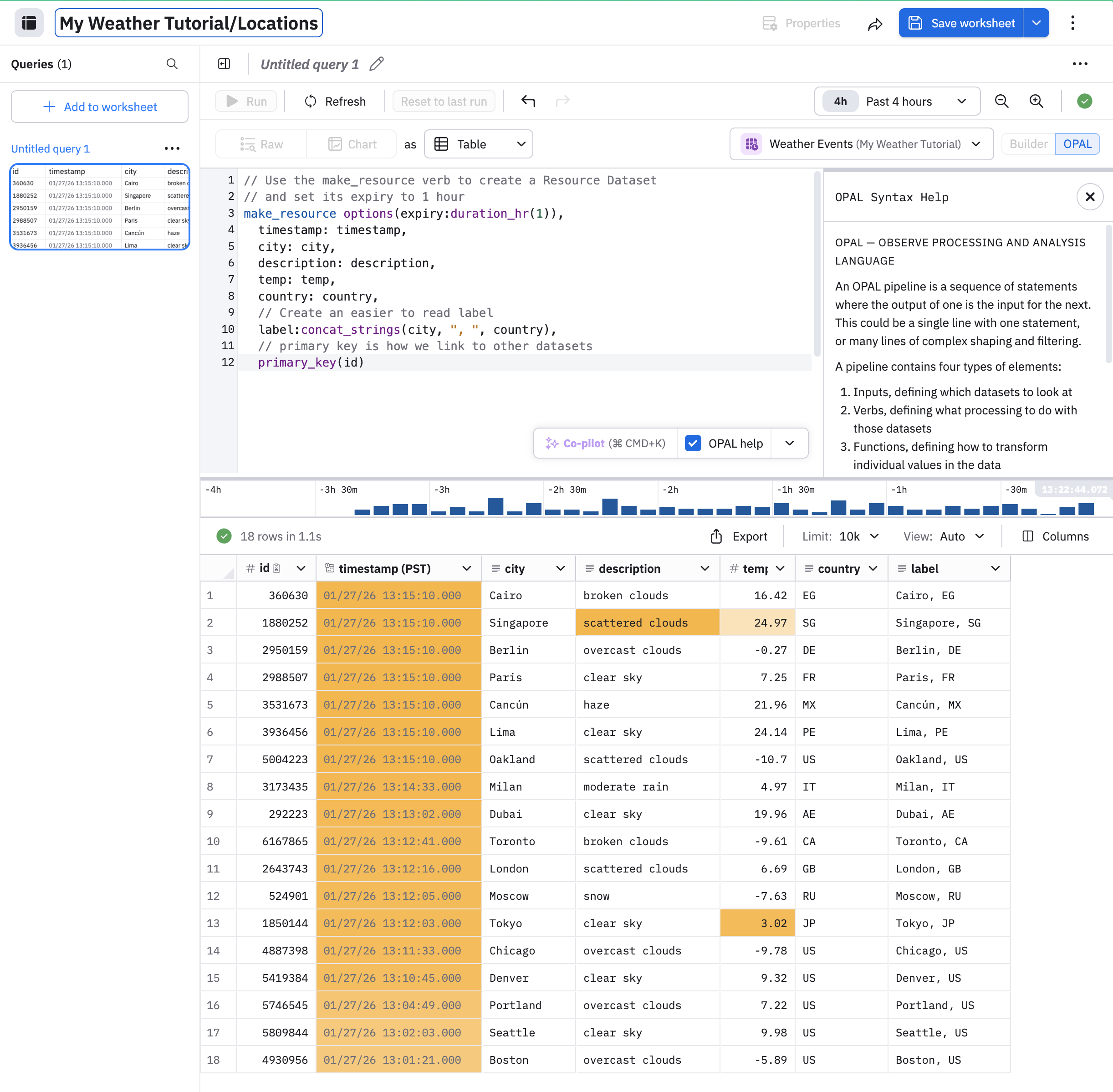 // Use the make_resource verb to create a Resource Dataset // and set its expiry to 1 hour make_resource options(expiry:duration_hr(1)), timestamp: timestamp, city: city, description: description, temp: temp, country: country, // Create an easier to read label label:concat_strings(city, ", ", country), // primary key is how we link to other datasets primary_key(id)