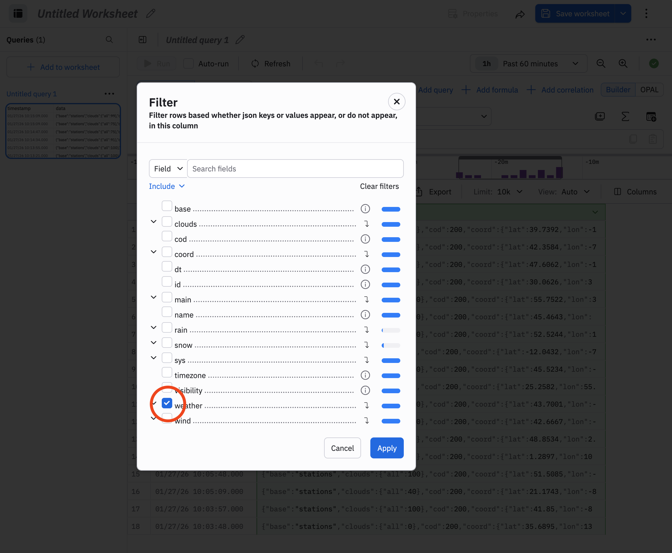 - Select weather from the Filter Rail to filter observations with only weather data and not empty fields.