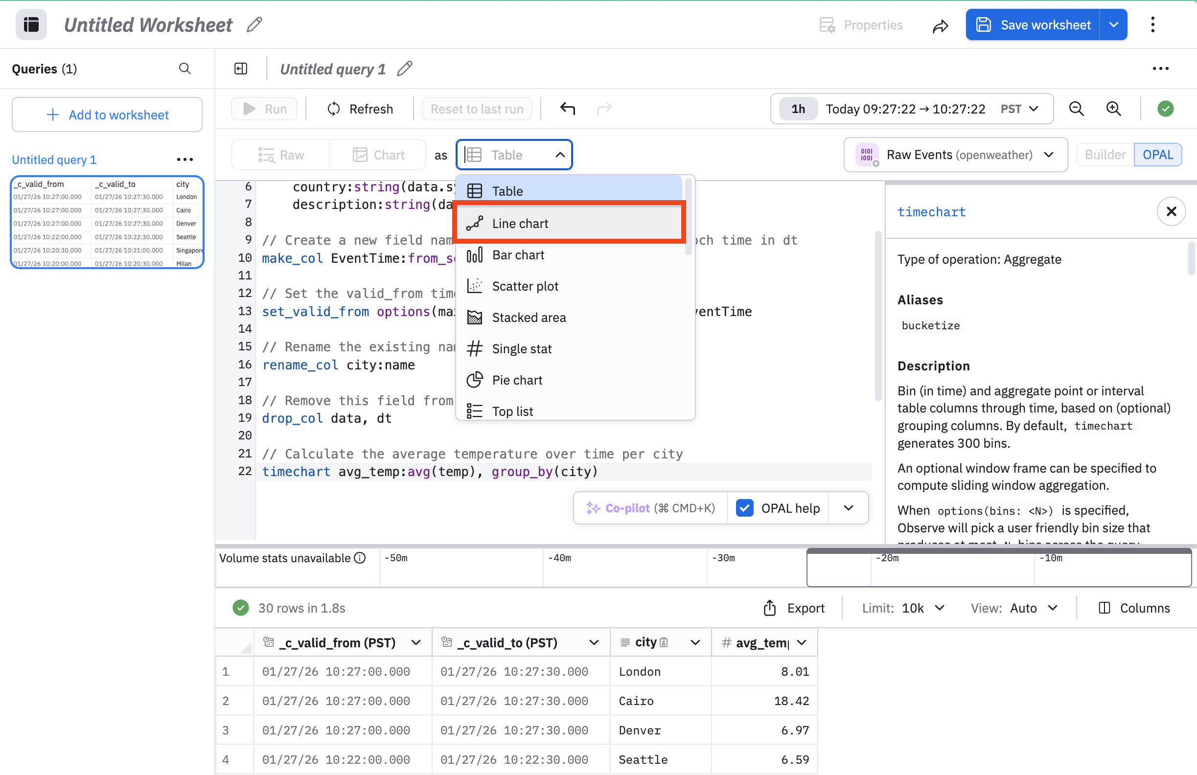 timechart avg_temp:avg(temp), group_by(city)You can now display your data as a graph of temperatures for the cities in your data by changing the visualization type at the top center. It is currently set to Table; change it to Line Chart.