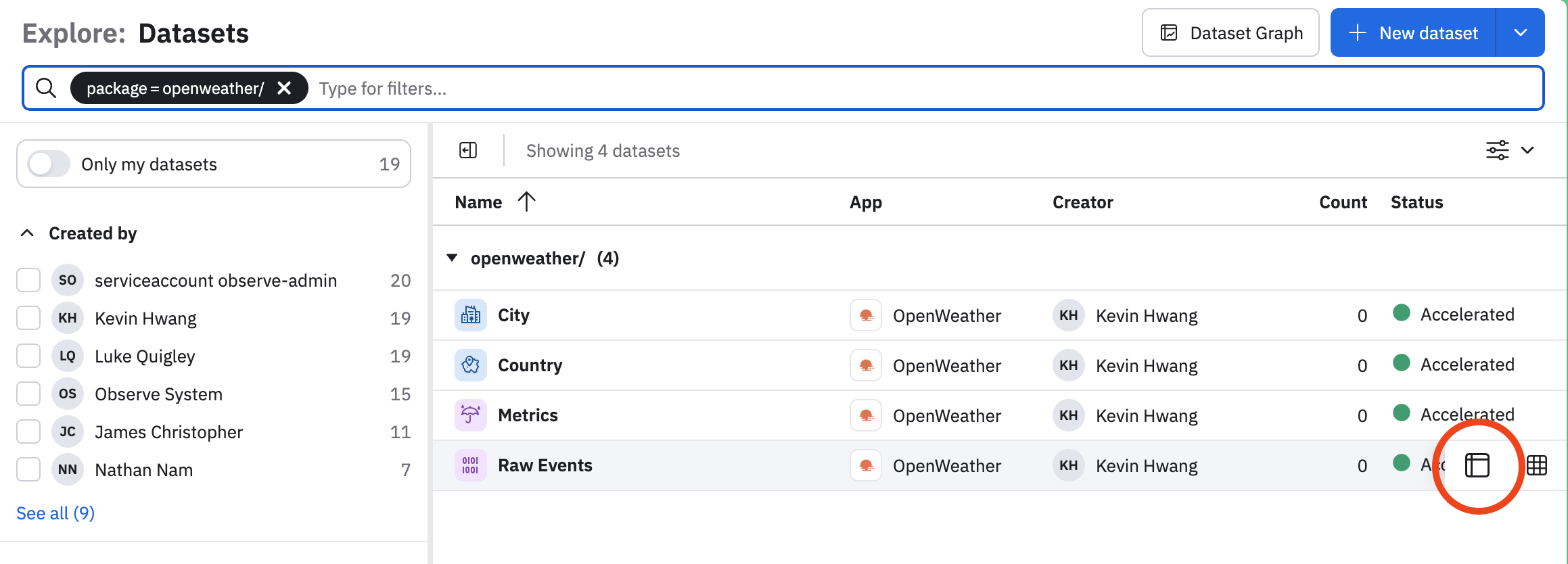 By prefixing My Weather Tutorial to the name of the Dataset, it allows a natural namespacing in Observe lister pages. These are colloquially referred to as package names, and allows you to group related Datasets, making it easier to find them later.