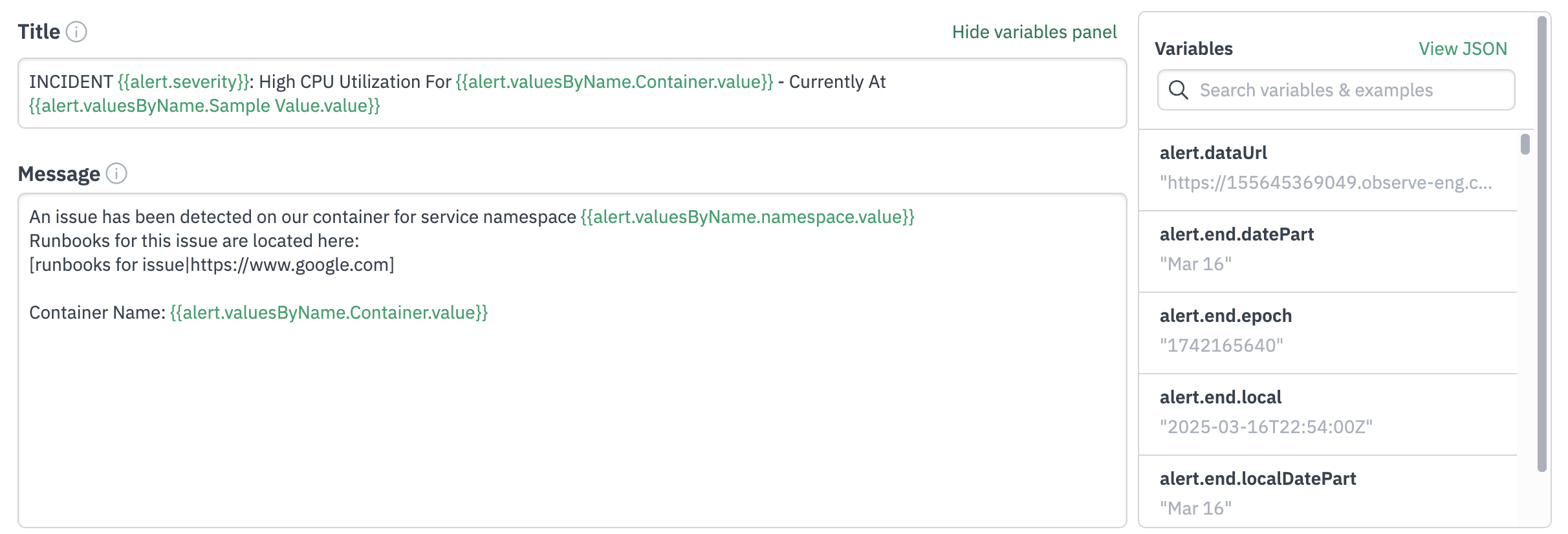 For example lets take a threshold monitor that monitors container CPU utilization, and has the following content for the {{monitor.variables.title}} and {{monitor.variables.message}} sections respectively.