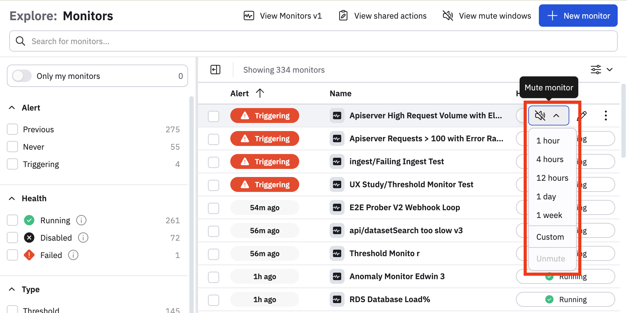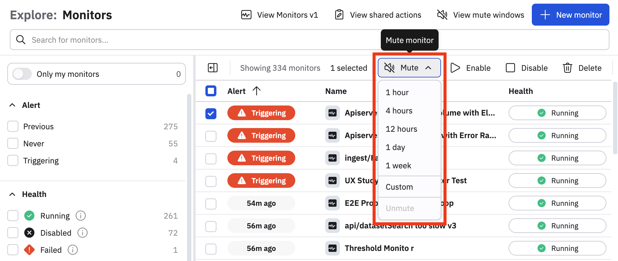 Starting in the Monitors list, use a monitor's context menu to mute it. You can also multi-select many monitors and use the toolbar's Mute button.