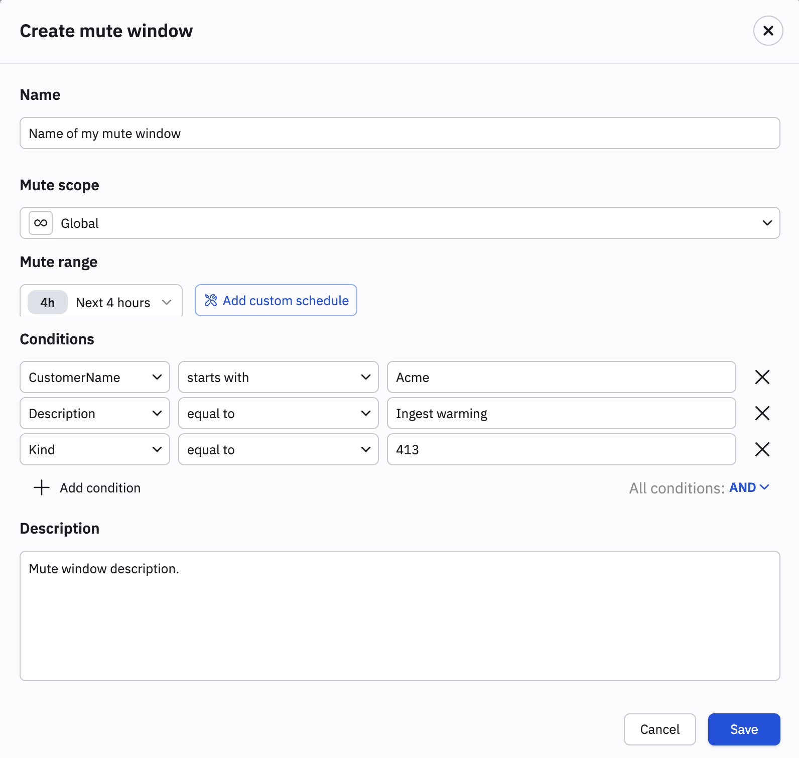 For example, to mute a particular customer's ingest warnings, you might set Customer-Name starts with Acme and description equal to Ingest warning and kind equal to 413.
