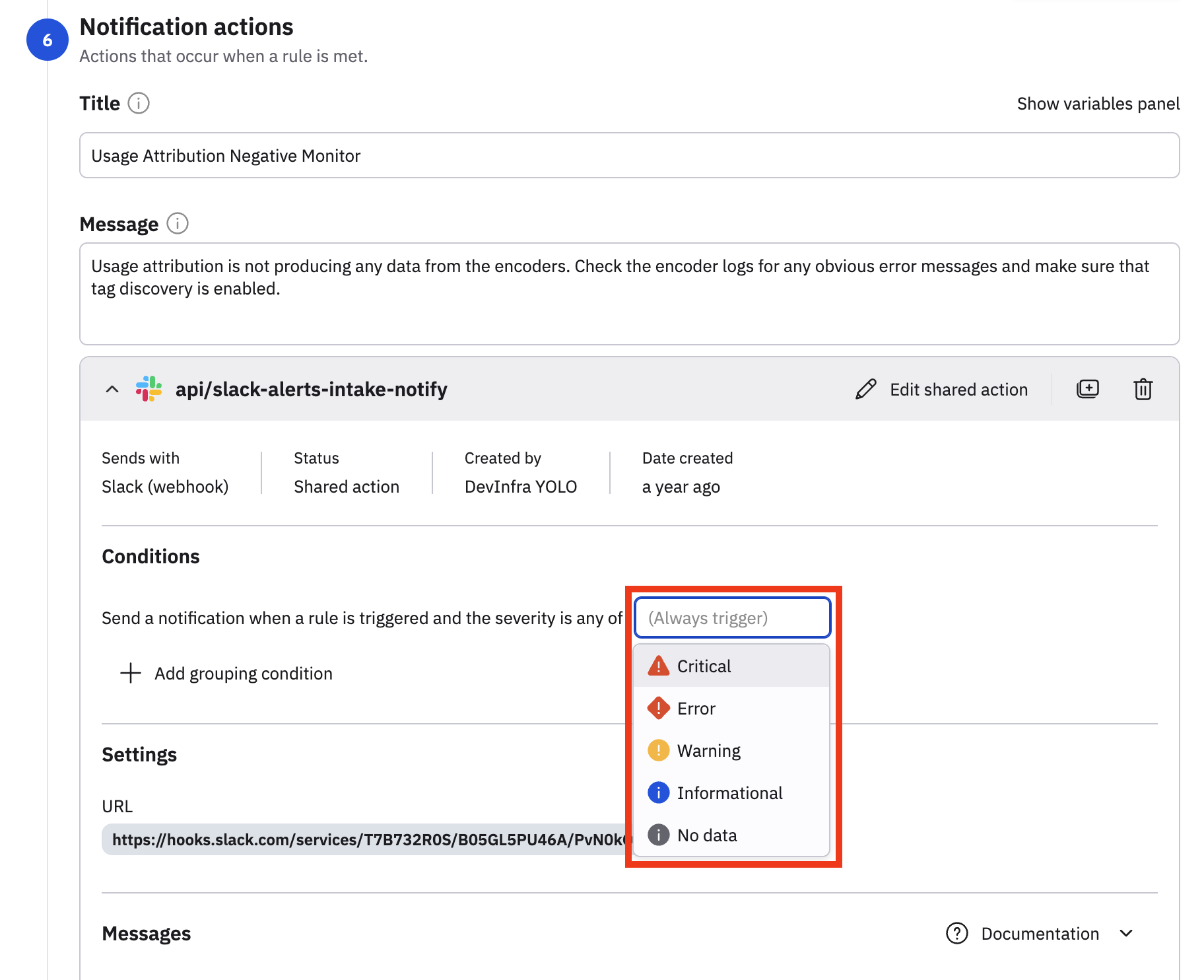 Now, the No data severity can be consumed by any new or existing actions in the Monitor. In the Notification actions, we have an existing Slack action configured, and we can use the No data severity in this existing action, or create a new action using the No data severity.