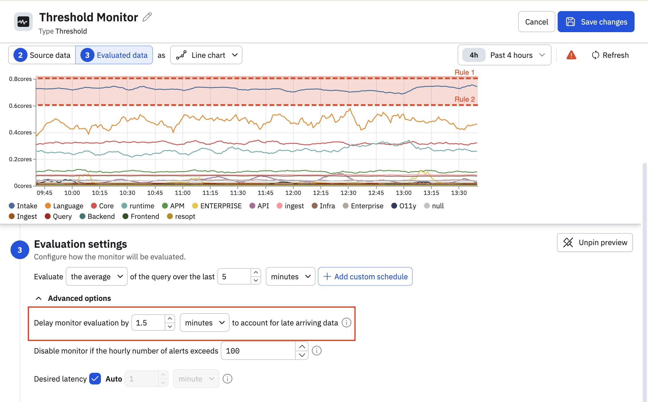 - For a 10-minute lookback, the monitor evaluates data from 1.5-11.5 minutes ago.