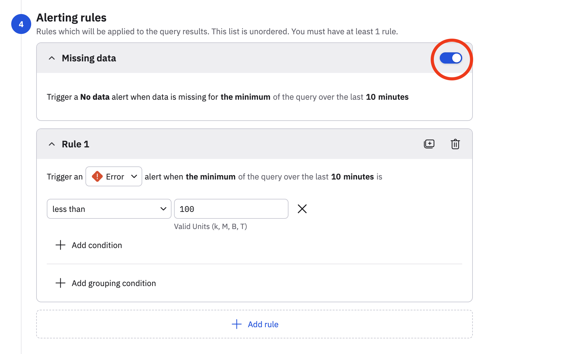 We edit the monitor, and in the Alerting rules section, slide the Missing data toggle to the on position.