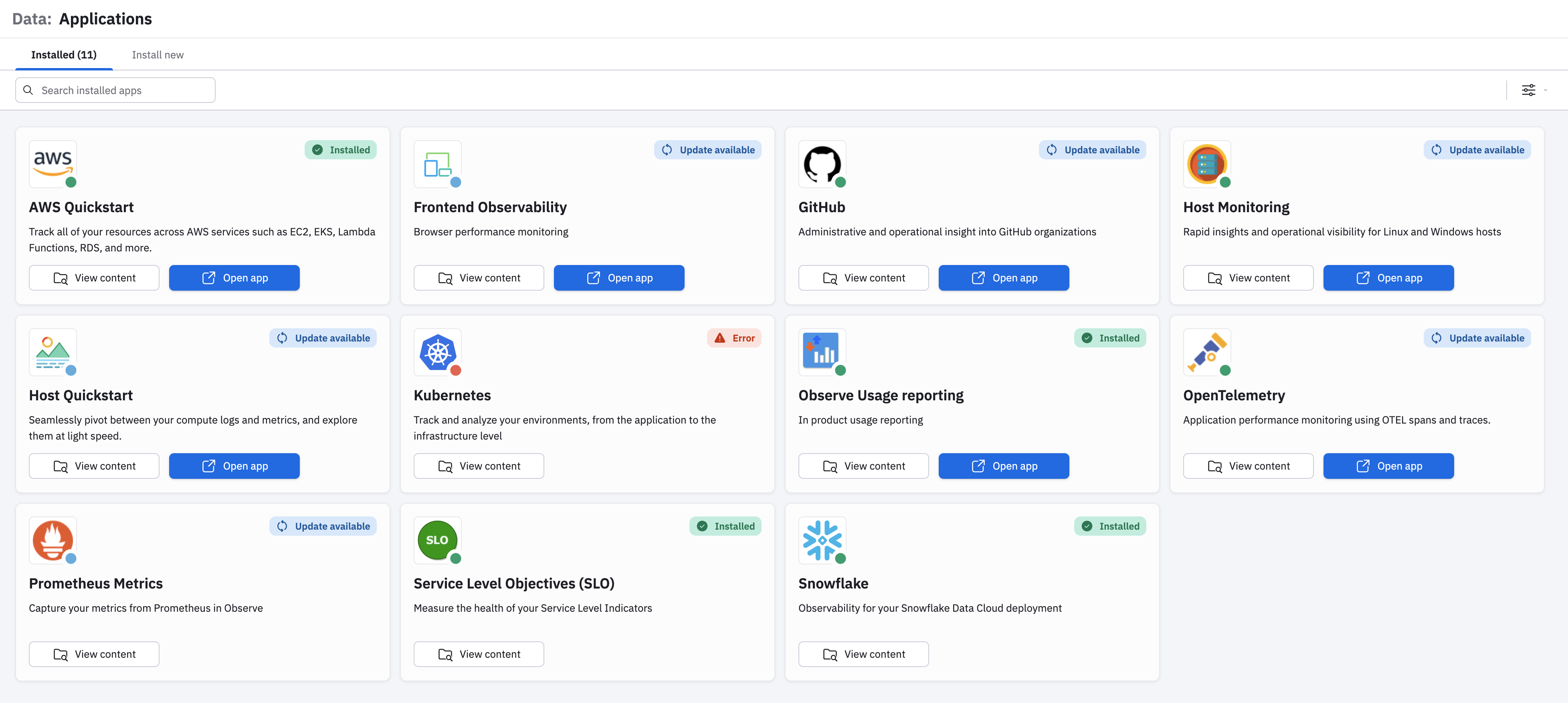 - In Observe, select Data & integrations > Applications in the left navigation bar.