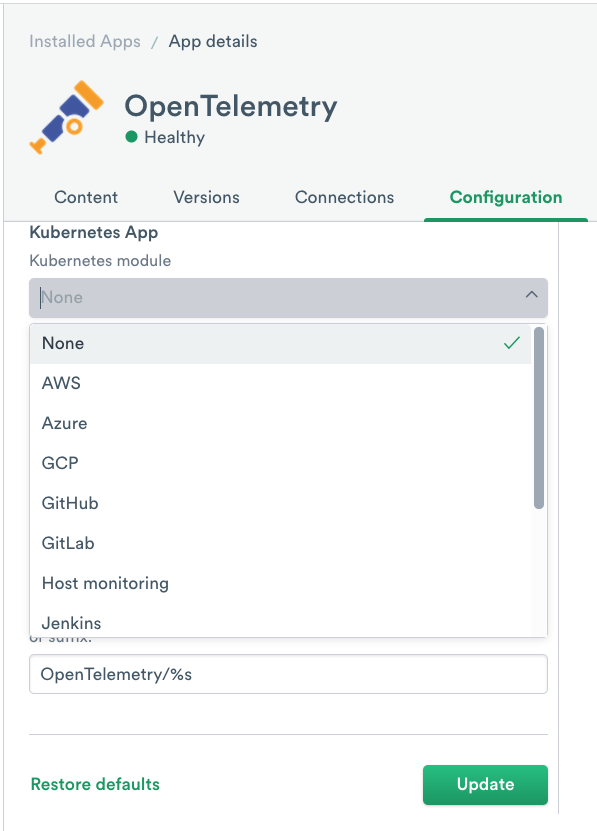 Apps consist of self-service packages that include data ingestion, Datasets, Worksheets, and sample monitors to help you investigate issues in your infrastructure. Ingest and navigate your data in minutes with a single app install.