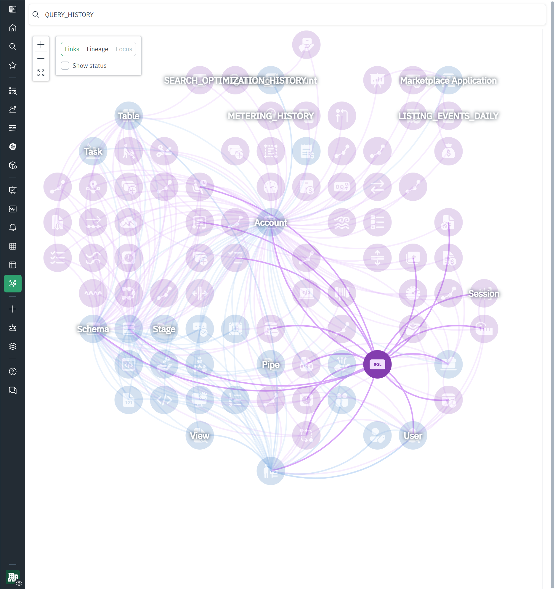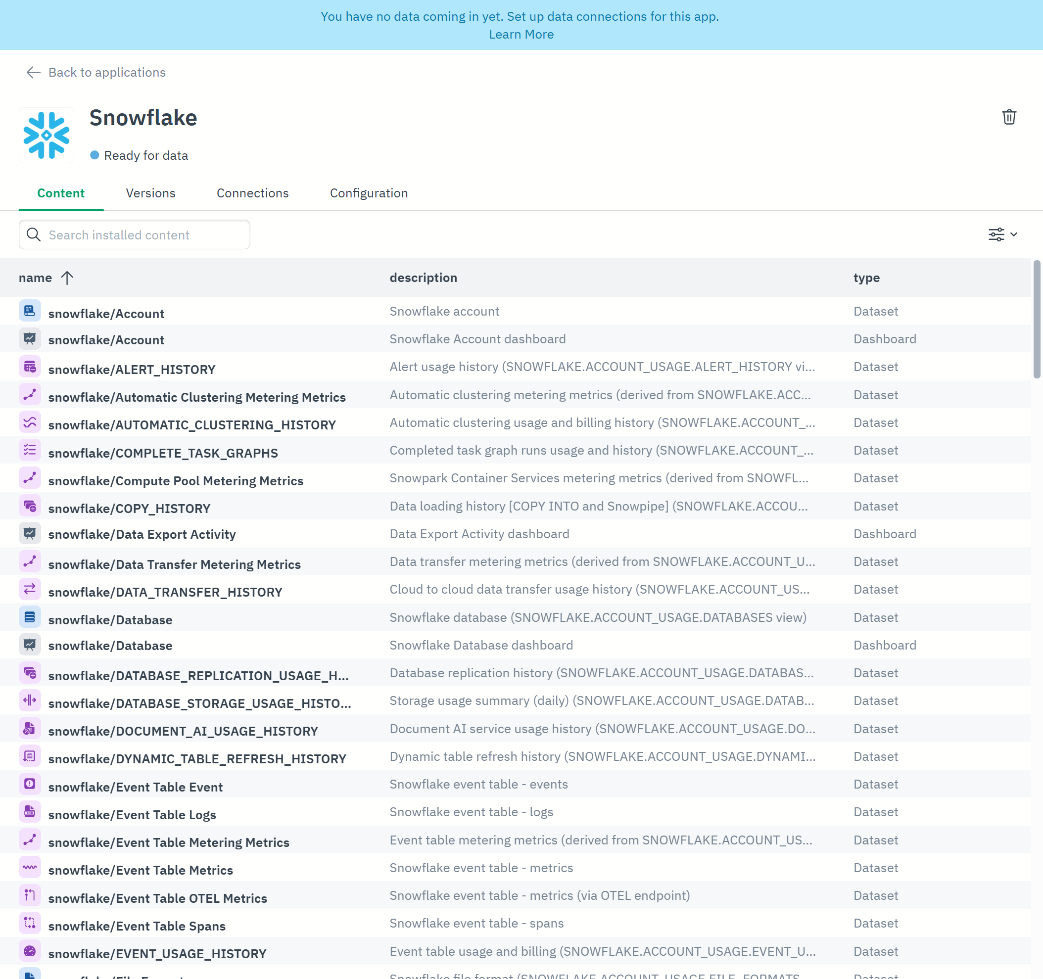 Using Observe data transformation features, Snowflake app/integration builds a curated data graph of connected datasets, including things like query and login history, usage and billing metrics, and traces.
