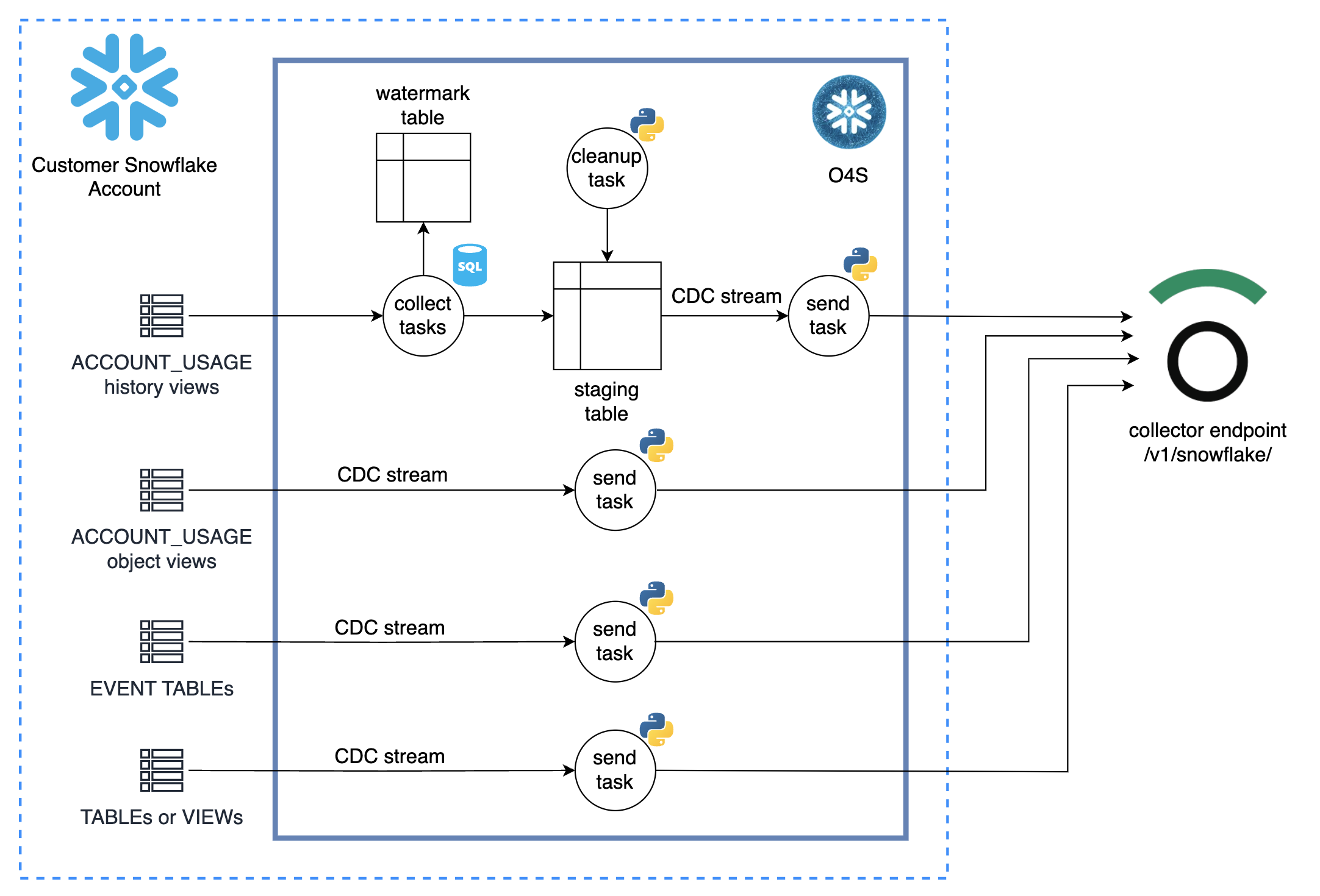 The Snowflake for Observe native application uses scheduled tasks executed by virtual warehouse OR serverless tasks to send records from SNOWFLAKE shared database views and Event Tables to Observe.