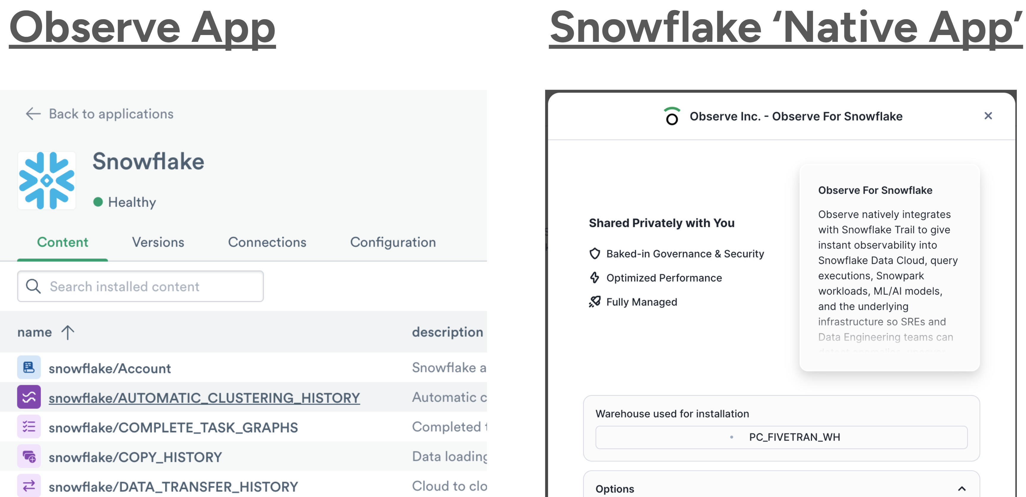 Data sent from Snowflake by Snowflake for Observe native application is processed by Snowflake app/integration in Observe.