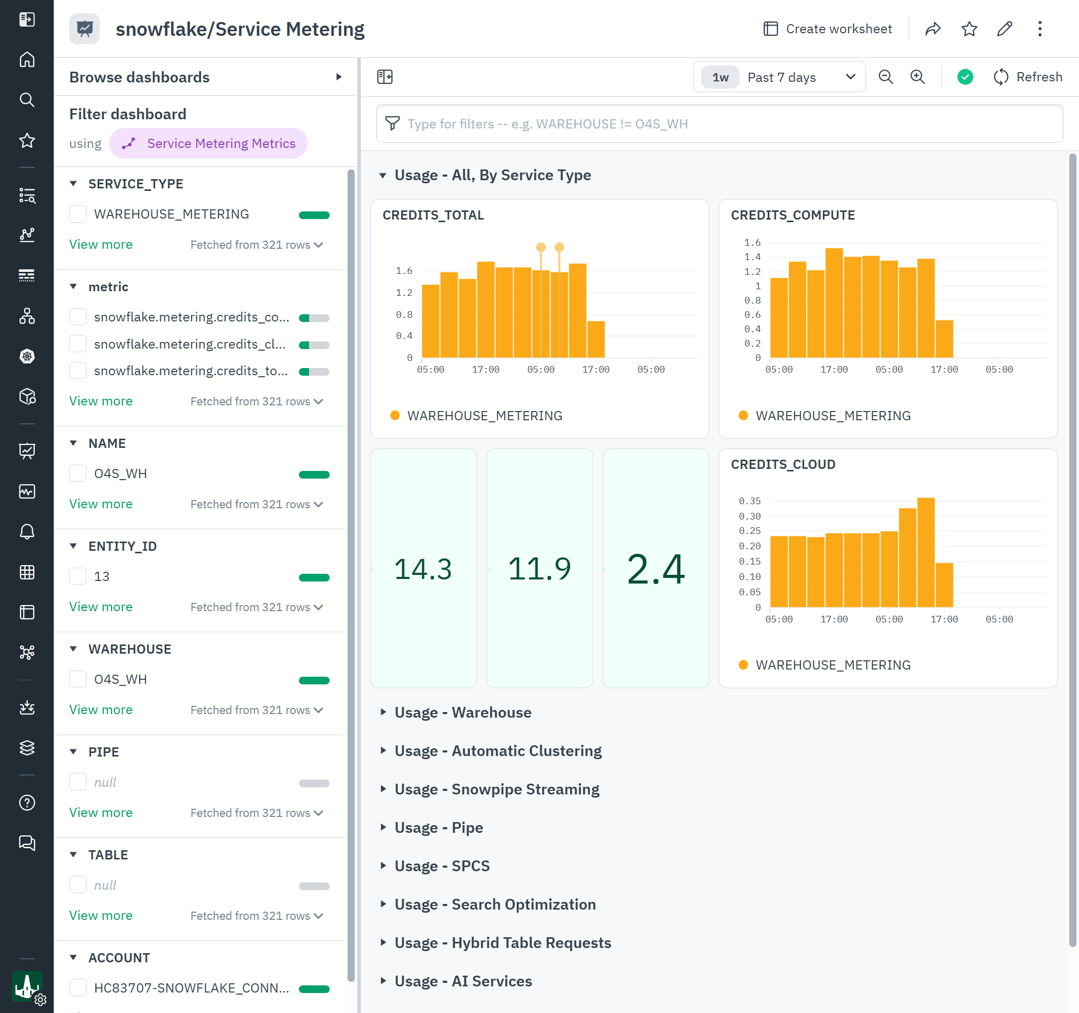 The app also provides prebuilt dashboards for common Snowflake management features as well as logs (query history, task history), metrics (billing, data loading, data transfer, query scans) and traces (Snowpark code, SPCS, cortex, UDFs).