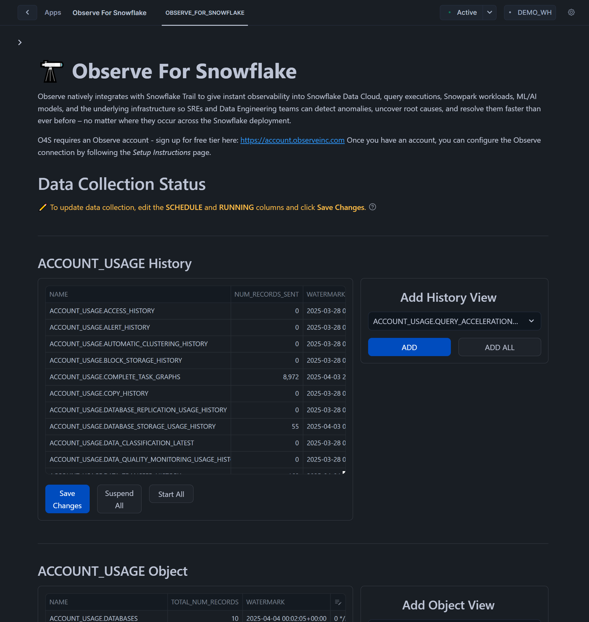 Snowflake management and observability data is gathered from SNOWFLAKE shared database and event table(s) using the native Snowflake for Observe application available from Snowflake Marketplace.