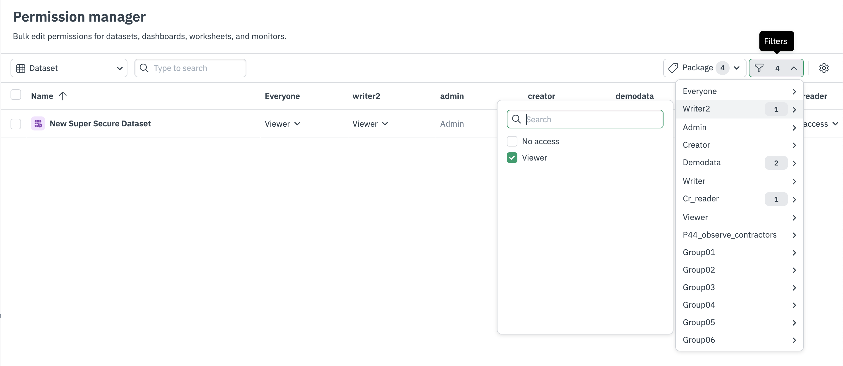 Permission manager allows you to quickly apply access permissions for multiple Datasets, Dashboards, Monitors and Worksheets. For all object types, you can filter by group and associated group permissions.