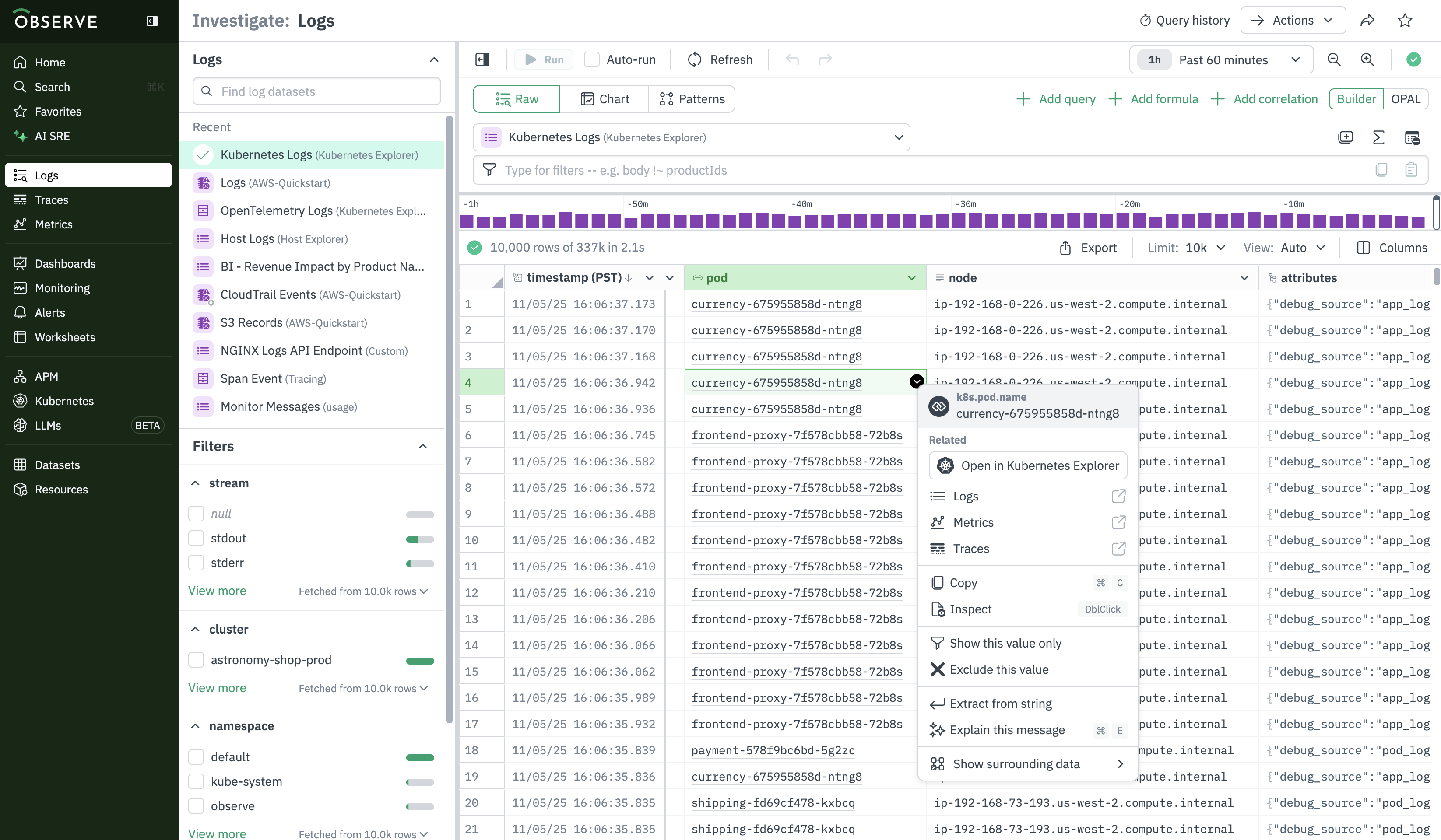 Observe supports flexibly pivoting between data types such as Logs, Metrics, and Traces based on shared links to a resource. To learn more about resources, read about Resource datasets.