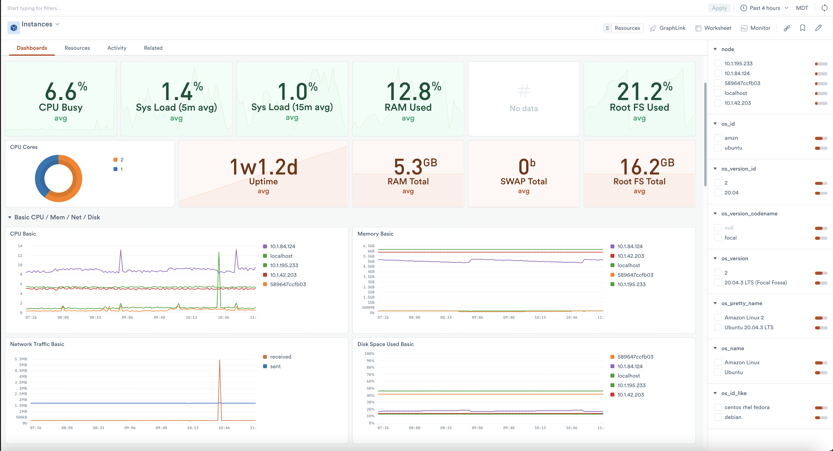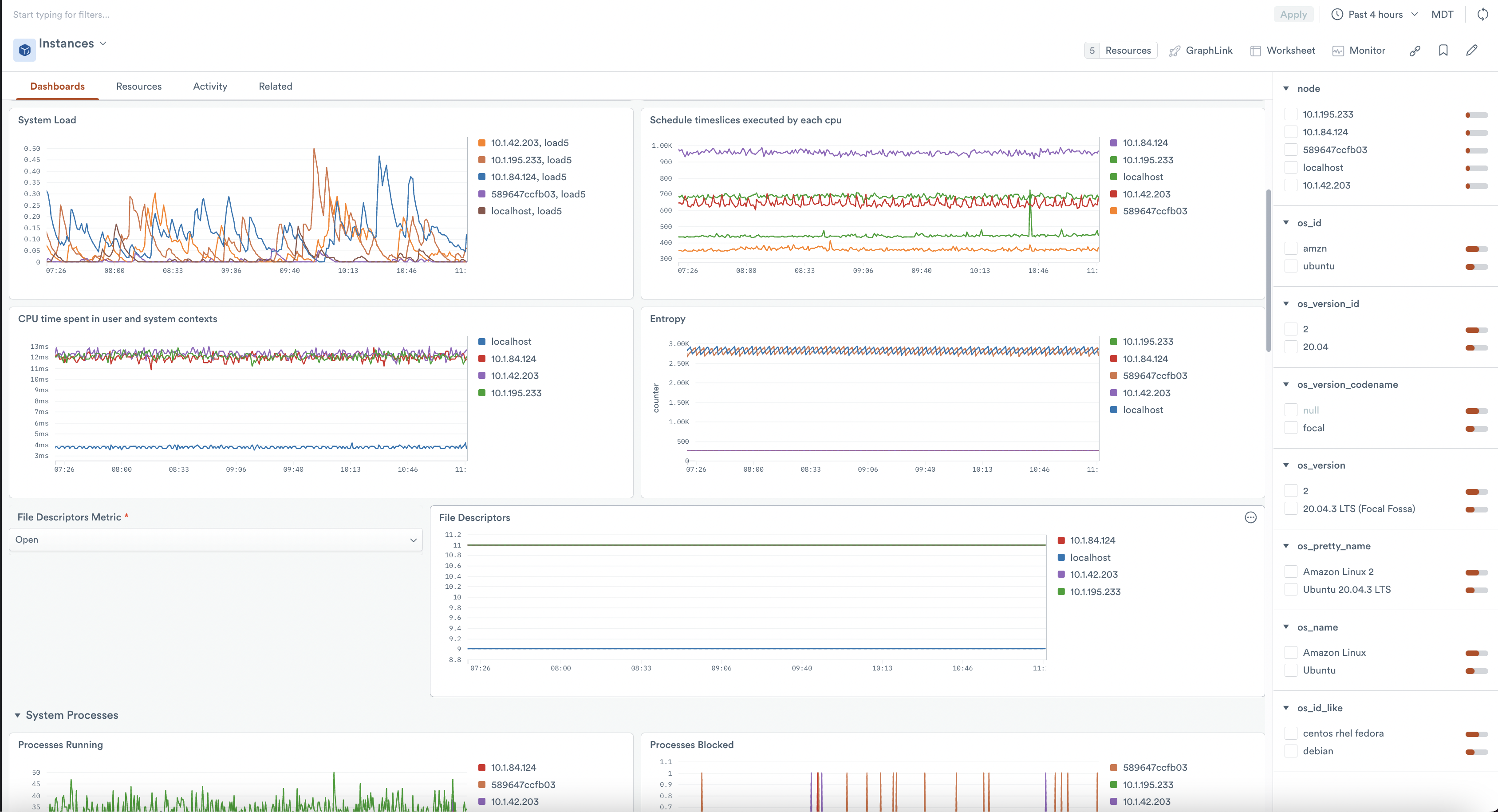 To see the health and performance of your nodes, after installing the app, go to the Instance dataset in Observe. This dataset models the nodes that are running the Node exporter in your environment, whether in a Kubernetes cluster or as a service on a standalone host. From this resource, you can filter to any number of node instances and use the following dashboards to get insight into their health and status.