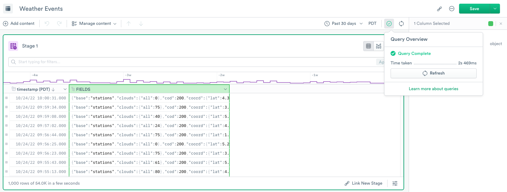 A complete OPAL script consists of inputs, verbs, functions, and outputs defining the desired result. When you create a query in a worksheet using the console and click Run, Observe executes all stages in a query on the Datasets. In a Dashboard, Observe runs the query in the background.